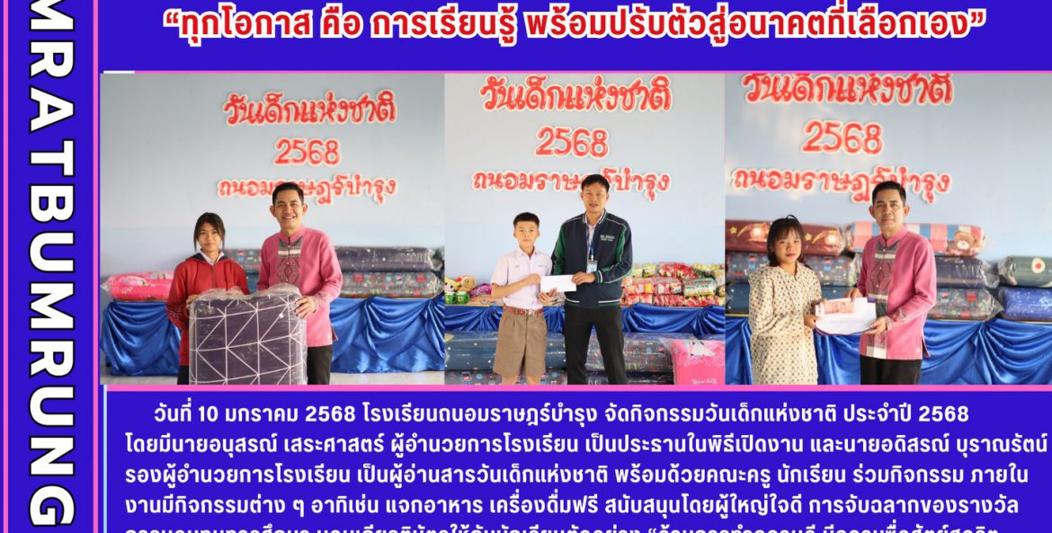 👉วันที่ 10 มกราคม 2568 โรงเรียนถนอมราษฎร์บำรุง จัดกิจกรรมวันเด็กแห่งชาติ ประจำปี 2568 โดยมีนายอนุสรณ์ เสระศาสตร์ ผู้อำนวยการโรงเรียน เป็นประธานในพิธีเปิดงาน และนายอดิสรณ์ บุราณรัตน์ รองผู้อำนวยการโรงเรียน เป็นผู้อ่านสารวันเด็กแห่งชาติ พร้อมด้วยคณะครู นักเรียน ร่วมกิจกรรม