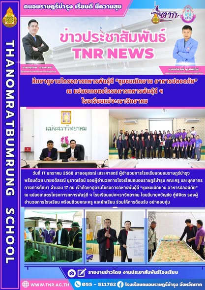 วันที่ 17 มกราคม 2568 นายอนุสรณ์ เสระศาสตร์ ผู้อำนวยการโรงเรียนถนอมราษฎร์บำรุง พร้อมด้วย นายอดิสรณ์ บุราณรัตน์ รองผู้อำนวยการโรงเรียนถนอมราษฎร์บำรุง คณะครู และบุคลากรทางการศึกษา จำนวน 17 คน เข้าศึกษาดูงานโครงการทหารพันธุ์ดี “ชุมชนเบิกบาน อาหารปลอดภัย” ณ แปลงเกษตรโครงการทหารพันธุ์ดี ฯ โรงเรียนแม่จะเราวิทยาคม โดยมีนายขวัญชัย ตู้พิจิตร รองผู้อำนวยการโรงเรียน พร้อมด้วยคณะครู และนักเรียน ร่วมให้การต้อนรับ อย่างอบอุ่น #ทางโรงเรียนถนอมราษฎร์บำรุงขอขอบคุณโรงเรียนแม่จะเราวิทยาคมเป็นอย่างสูงค่ะ