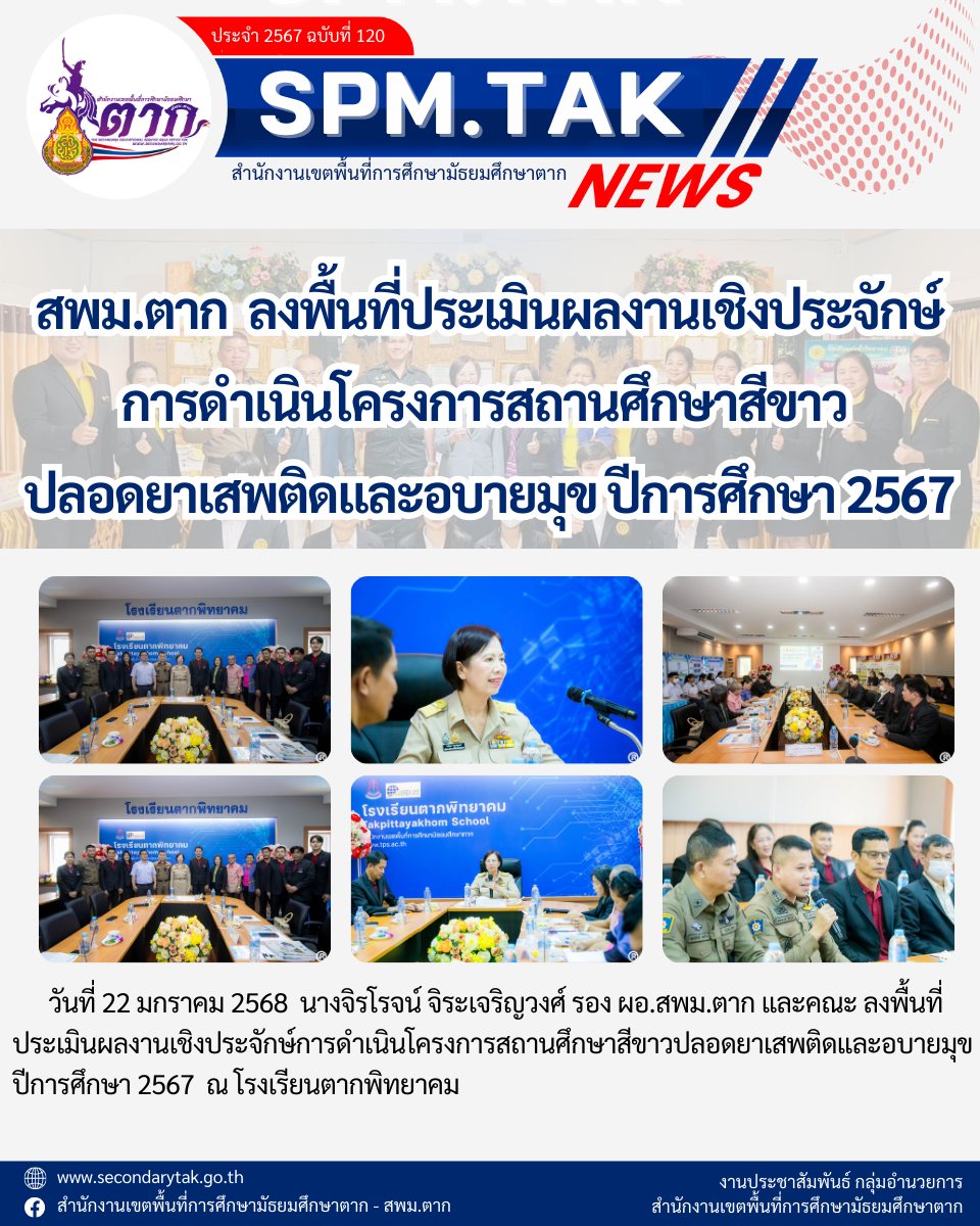 สพม.ตาก ลงพื้นที่ประเมินผลงานเชิงประจักษ์ การดำเนินโครงการสถานศึกษาสีขาว ปลอดยาเสพติดและอบายมุข ปีการศึกษา 2567 วรวุฒิ เนื้อนิ่ม 23 มกราคม 2568 จำนวนคนดู 5