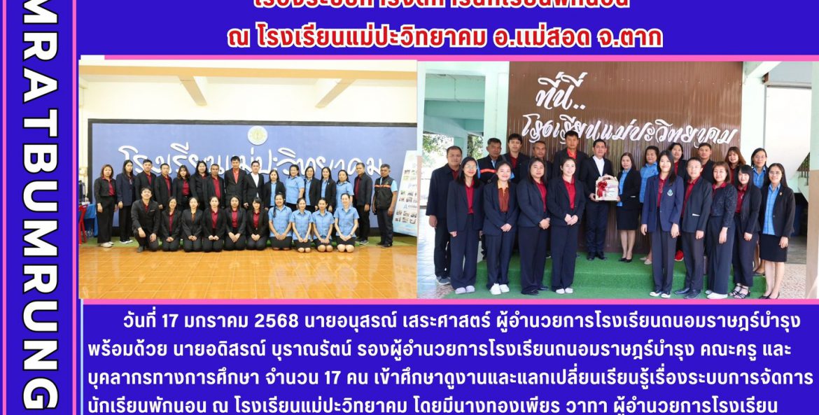 วันที่ 17 มกราคม 2568 นายอนุสรณ์ เสระศาสตร์ ผู้อำนวยการโรงเรียนถนอมราษฎร์บำรุง พร้อมด้วย นายอดิสรณ์ บุราณรัตน์ รองผู้อำนวยการโรงเรียนถนอมราษฎร์บำรุง คณะครู และบุคลากรทางการศึกษา จำนวน 17 คน เข้าศึกษาดูงานและแลกเปลี่ยนเรียนรู้เรื่องระบบการจัดการนักเรียนพักนอน ณ โรงเรียนแม่ปะวิทยาคม โดยมีนางทองเพียร วาทา ผู้อำนวยการโรงเรียนแม่ปะวิทยาคม พร้อมด้วยคณะครู ร่วมให้การต้อนรับ อย่างอบอุ่น