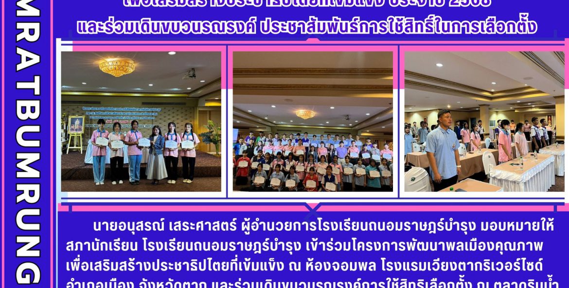 นายอนุสรณ์ เสระศาสตร์ ผู้อำนวยการโรงเรียนถนอมราษฎร์บำรุง มอบหมายให้สภานักเรียน โรงเรียนถนอมราษฎร์บำรุง เข้าร่วมโครงการพัฒนาพลเมืองคุณภาพ เพื่อเสริมสร้างประชาธิปไตยที่เข้มแข็ง ประจำปี 2568 ณ ห้องจอมพล โรงแรมเวียงตากริเวอร์ไซด์ อำเภอเมือง จังหวัดตาก และร่วมเดินขบวนรณรงค์การใช้สิทธิเลือกตั้ง ณ ตลาดริมน้ำ และ กาดนั่งยองคล้องย่าม จ.ตาก