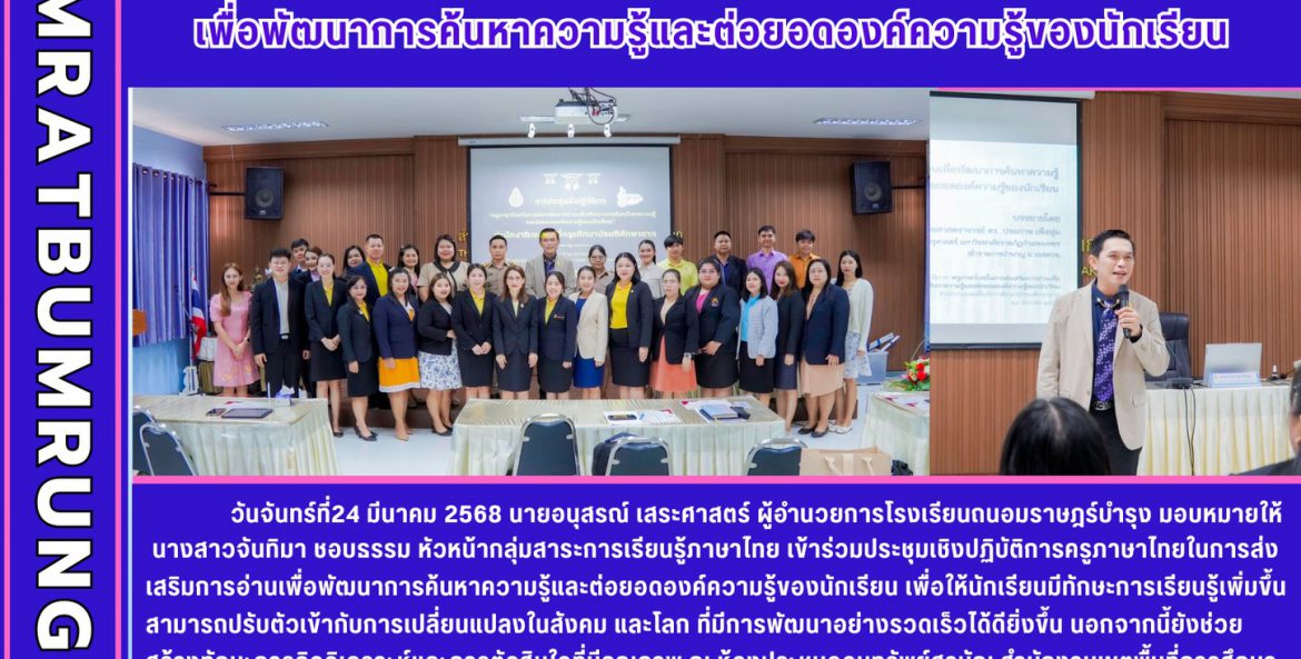 วันจันทร์ที่24 มีนาคม 2568 นายอนุสรณ์ เสระศาสตร์ ผู้อำนวยการโรงเรียนถนอมราษฎร์บำรุง มอบหมายให้ นางสาวจันทิมา ชอบธรรม หัวหน้ากลุ่มสาระการเรียนรู้ภาษาไทย เข้าร่วมประชุมเชิงปฏิบัติการครูภาษาไทยในการส่งเสริมการอ่านเพื่อพัฒนาการค้นหาความรู้และต่อยอดองค์ความรู้ของนักเรียน เพื่อให้นักเรียนมีทักษะการเรียนรู้เพิ่มขึ้นสามารถปรับตัวเข้ากับการเปลี่ยนแปลงในสังคม และโลก ที่มีการพัฒนาอย่างรวดเร็วได้ดียิ่งขึ้น นอกจากนี้ยังช่วยสร้างทักษะการคิดวิเคราะห์และการตัดสินใจที่มีคุณภาพ ณ ห้องประชุมออมทรัพย์สามัญ สำนักงานเขตพื้นที่การศึกษามัธยมศึกษาตาก