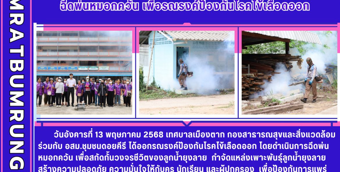 วันอังคารที่ 13 พฤษภาคม 2568 เทศบาลเมืองตาก กองสาธารณสุขและสิ่งแวดล้อม ร่วมกับ อสม.ชุมชนดอยคีรี ได้ออกรณรงค์ป้องกันโรคไข้เลือดออก โดยดำเนินการฉีดพ่นหมอกควัน เพื่อสกัดกั้นวงจรชีวิตของลูกน้ำยุงลาย กำจัดแหล่งเพาะพันธุ์ลูกน้ำยุงลาย สร้างความปลอดภัย ความมั่นใจให้กับครู นักเรียน และผู้ปกครอง เพื่อป้องกันการแพร่ระบาดของโรคไข้เลือดออก ณ โรงเรียนถนอมราษฎร์บำรุง