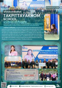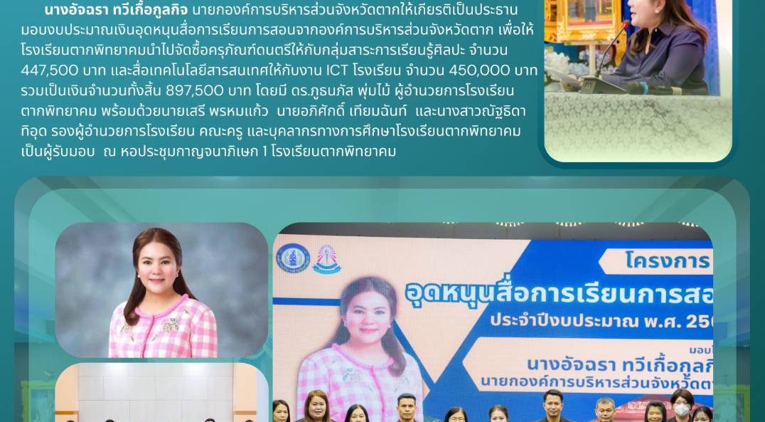 นางอัจฉรา ทวีเกื้อกูลกิจ นายกองค์การบริหารส่วนจังหวัดตากให้เกียรติเป็นประธานมอบงบประมาณเงินอุดหนุนสื่อการเรียนการสอนจากองค์การบริหารส่วนจังหวัดตาก เพื่อให้โรงเรียนตากพิทยาคมนำไปจัดซื้อครุภัณฑ์ดนตรีให้กับกลุ่มสาระการเรียนรู้ศิลปะ จำนวน 447,500 บาท และสื่อเทคโนโลยีสารสนเทศให้กับงาน ICT โรงเรียน จำนวน 450,000 บาท รวมเป็นเงินจำนวนทั้งสิ้น 897,500 บาท โดยมี ดร.ภูธนภัส พุ่มไม้ ผู้อำนวยการโรงเรียนตากพิทยาคม พร้อมด้วยนายเสรี พรหมแก้ว นายอภิศักดิ์ เทียมฉันท์ และนางสาวณัฐธิดา ทิอุด รองผู้อำนวยการโรงเรียน คณะครู และบุคลากรทางการศึกษาโรงเรียนตากพิทยาคมเป็นผู้รับมอบ ณ หอประชุมกาญจนาภิเษก 1 โรงเรียนตากพิทยาคม