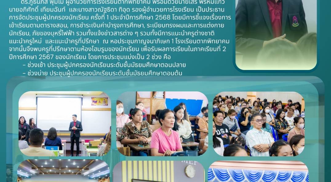 ดร.ภูธนภัส พุ่มไม้ ผู้อำนวยการโรงเรียนตากพิทยาคม พร้อมด้วยนายเสรี พรหมแก้ว นายอภิศักดิ์ เทียมฉันท์ และนางสาวณัฐธิดา ทิอุด รองผู้อำนวยการโรงเรียน เป็นประธานการจัดประชุมผู้ปกครองนักเรียน ครั้งที่ 1 ประจำปีการศึกษา 2568 โดยมีการชี้แจงเรื่องการเข้าเรียนตามตารางสอน, การชำระเงินค่าบำรุงการศึกษา, ระเบียบทรงผมและการแต่งกายนักเรียน, ภัยของบุหรี่ไฟฟ้า รวมทั้งแจ้งข่าวสารต่าง ๆ รวมทั้งมีการแนะนำครูต่างชาติ