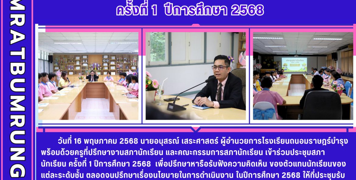 วันที่ 16 พฤษภาคม 2568 นายอนุสรณ์ เสระศาสตร์ ผู้อำนวยการโรงเรียนถนอมราษฎร์บำรุง พร้อมด้วยครูที่ปรึกษางานสภานักเรียน และคณะกรรมการสภานักเรียน เข้าร่วมประชุมสภานักเรียน ครั้งที่ 1 ปีการศึกษา 2568 เพื่อปรึกษาหารือรับฟังความคิดเห็น ของตัวแทนนักเรียนของแต่ละระดับชั้น ตลอดจนปรึกษาเรื่องนโยบายในการดำเนินงาน ในปีการศึกษา 2568 ให้ที่ประชุมรับทราบ ณ ห้องประชุมโสตทัศนศึกษา “ธารน้ำใจ” โรงเรียนถนอมราษฎร์บำรุง