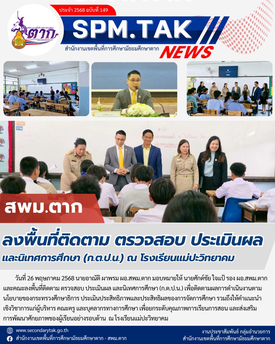 ลงพื้นที่ติดตาม ตรวจสอบ ประเมินผล และนิเทศการศึกษา (ก.ต.ป.น.) ณ โรงเรียนแม่ปะวิทยาคม วรวุฒิ เนื้อนิ่ม 27 พฤษภาคม 2568 จำนวนคนดู 1
