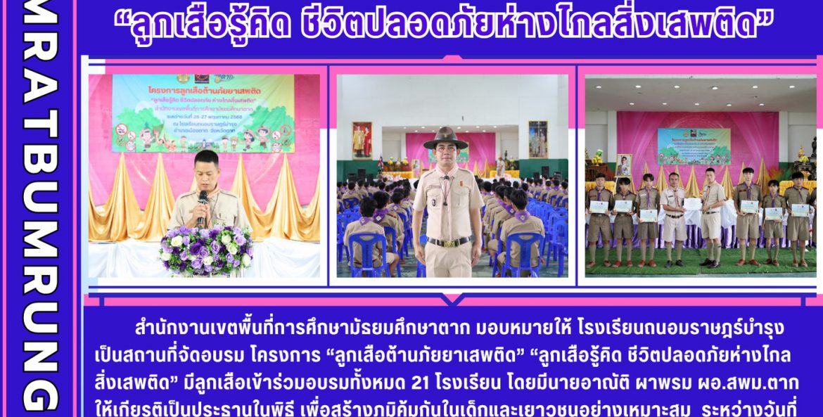สำนักงานเขตพื้นที่การศึกษามัธยมศึกษาตาก มอบหมายให้ โรงเรียนถนอมราษฎร์บำรุง เป็นสถานที่จัดอบรม โครงการ “ลูกเสือต้านภัยยาเสพติด” “ลูกเสือรู้คิด ชีวิตปลอดภัยห่างไกลสิ่งเสพติด” มีลูกเสือเข้าร่วมอบรมทั้งหมด 21 โรงเรียน โดยมีนายอาณัติ ผาพรม ผอ.สพม.ตาก ให้เกียรติเป็นประธานในพิธี เพื่อสร้างภูมิคุ้มกันในเด็กและเยาวชนอย่างเหมาะสม ระหว่างวันที่ 26-27 พฤษภาคม พ.ศ. 2568 ณ โรงเรียนถนอมราษฎ์บำรุง อำเภอเมือง จังหวัดตาก