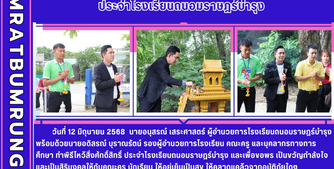 วันที่ 12 มิถุนายน 2568 นายอนุสรณ์ เสระศาสตร์ ผู้อำนวยการโรงเรียนถนอมราษฎร์บำรุง พร้อมด้วยนายอดิสรณ์ บุราณรัตน์ รองผู้อำนวยการโรงเรียน คณะครู และบุคลากรทางการศึกษา ทำพิธีไหว้สิ่งศักดิ์สิทธิ์ ประจำโรงเรียนถนอมราษฎร์บำรุง และเพื่อขอพร เป็นขวัญกำลังใจและเป็นสิริมงคลให้กับคณะครู นักเรียน ให้อยู่เย็นเป็นสุข ให้คลาดแคล้วจากอุบัติภัยใดๆ ณ โรงเรียนถนอมราษฎร์บำรุง