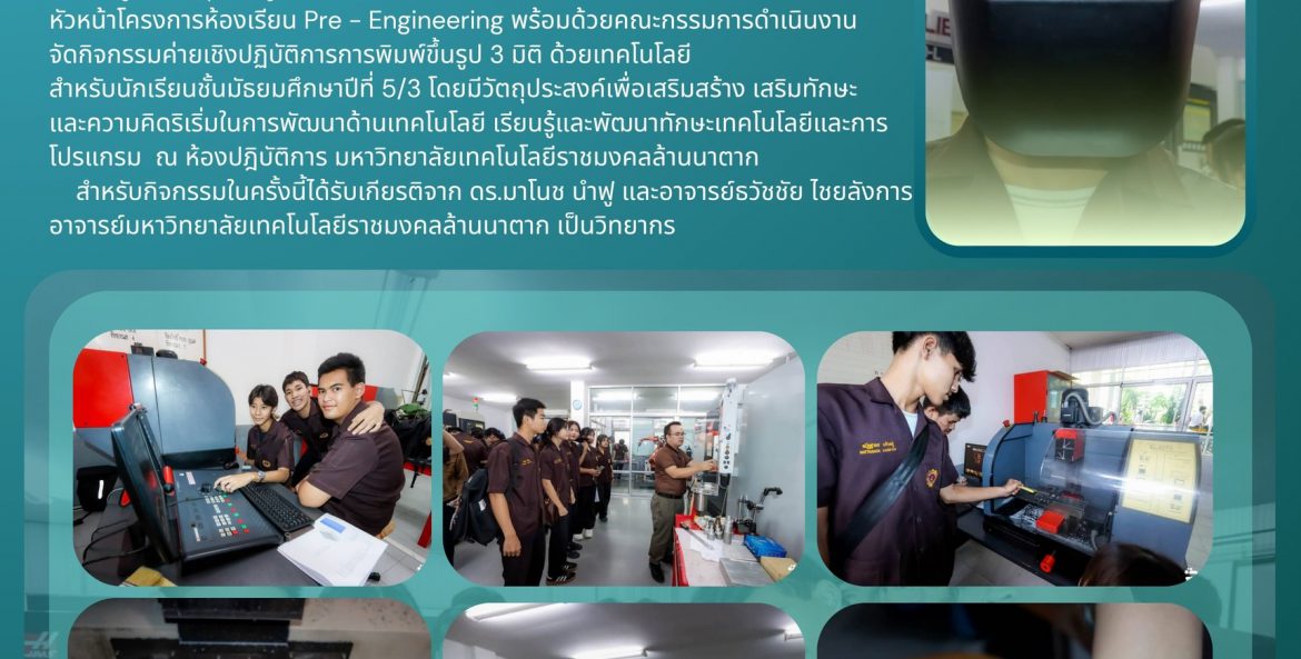 มอบหมายให้นางนิภา แหวเมือง หัวหน้าโครงการห้องเรียน Pre – Engineering พร้อมด้วยคณะกรรมการดำเนินงาน จัดกิจกรรมค่ายเชิงปฏิบัติการการพิมพ์ขึ้นรูป 3 มิติ ด้วยเทคโนโลยี สำหรับนักเรียนชั้นมัธยมศึกษาปีที่ 5/3 โดยมีวัตถุประสงค์เพื่อเสริมสร้าง เสริมทักษะ และความคิดริเริ่มในการพัฒนาด้านเทคโนโลยี เรียนรู้และพัฒนาทักษะเทคโนโลยีและการโปรแกรม ณ ห้องปฎิบัติการ มหาวิทยาลัยเทคโนโลยีราชมงคลล้านนาตาก