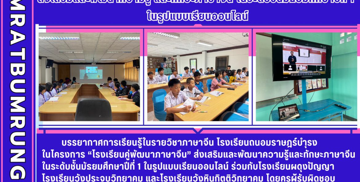ในโครงการ “โรงเรียนคู่พัฒนาภาษาจีน” ส่งเสริมและพัฒนาความรู้และทักษะภาษาจีนในระดับชั้นมัธยมศึกษาปีที่ 1 ในรูปแบบเรียนออนไลน์ ร่วมกับโรงเรียนผดุงปัญญา โรงเรียนวังประจบวิทยาคม และโรงเรียนวังหินกิตติวิทยาคม โดยครูผู้รับผิดชอบ ครูอริสรา สวาทะสุข ณ ห้องโสตทัศนศึกษา “ธารน้ำใจ” โรงเรียนถนอมราษฎร์บำรุง
