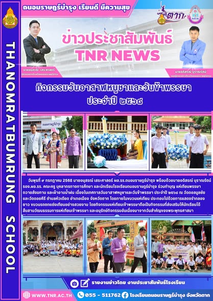 วันพุธที่ ๙ กรกฎาคม 2568 นายอนุสรณ์ เสระศาสตร์ ผอ.รร.ถนอมราษฎร์บำรุง พร้อมด้วยนายอดิสรณ์ บุราณรัตน์ รอง.ผอ.รร. คณะครู บุคลากรทางการศึกษา และนักเรียนโรงเรียนถนอมราษฎร์บำรุง ร่วมทำบุญ แห่เทียนพรรษา ถวายสังฆทาน และผ้าอาบน้ำฝน ให้ความรู้หน้าเสาธง เนื่องในเทศกาลวันอาสาฬหบูชาและวันข้าพรรษา ประจำปี ๒๕๖๘ ณ วัดดอลมูลชัย และวัดดอยคีรี ตำบลหัวเดียด อำเภอเมือง จังหวัดตาก โดยภายในขบวนแห่เทียน ประกอบไปด้วยการแสดงรำกลองยาว ขบวนรถตกแต่งเทียนอย่างสวยงาม โดยกิจกรรมแห่เทียนเข้าพรรษาถือเป็นกิจกรรมที่ส่งเสริมให้นักเรียนได้ สืบสานวัฒนธรรมการแห่เทียนเข้าพรรษา และอนุรักษ์กิจกรรมอันเนื่องมาจากวันสำคัญของพระพุทธศาสนา