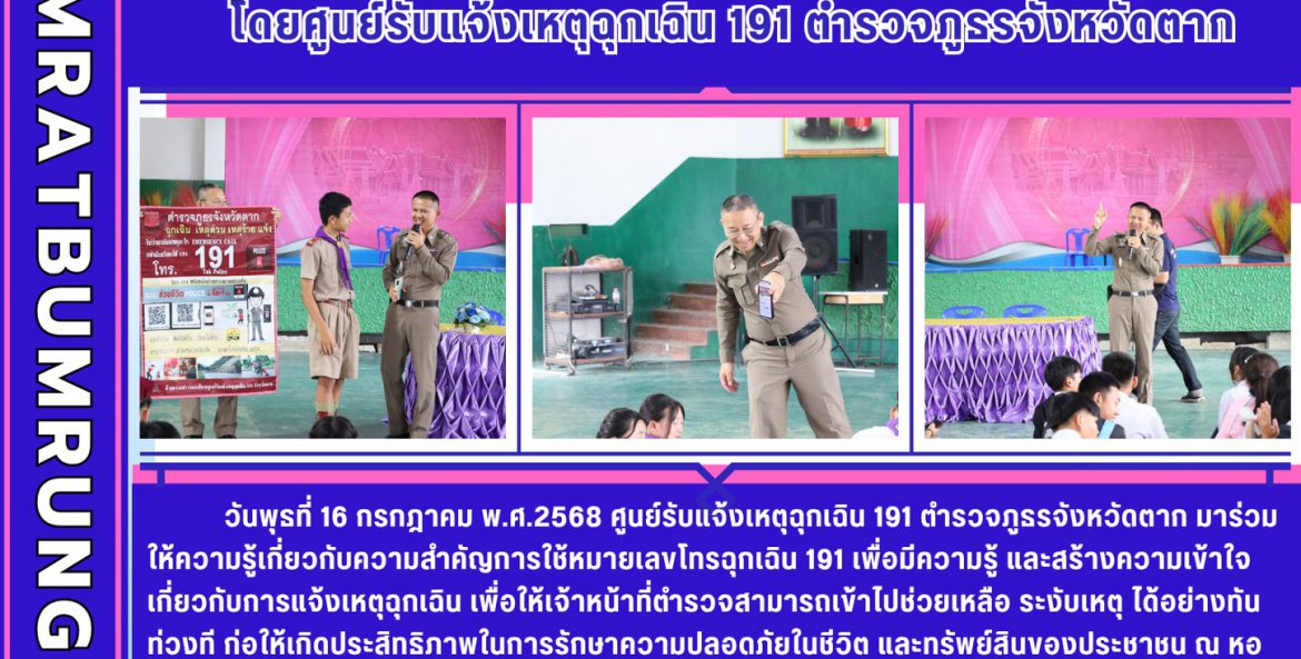วันพุธที่ 16 กรกฎาคม พ.ศ.2568 ศูนย์รับแจ้งเหตุฉุกเฉิน 191 ตำรวจภูธรจังหวัดตาก มาร่วมให้ความรู้เกี่ยวกับความสำคัญการใช้หมายเลขโทรฉุกเฉิน 191 เพื่อมีความรู้ และสร้างความเข้าใจเกี่ยวกับการแจ้งเหตุฉุกเฉิน เพื่อให้เจ้าหน้าที่ตำรวจสามารถเข้าไปช่วยเหลือ ระงับเหตุ ได้อย่างทันท่วงที ก่อให้เกิดประสิทธิภาพในการรักษาความปลอดภัยในชีวิต และทรัพย์สินของประชาชน ณ หอประชุมโรงเรียนถนอมราษฎร์บำรุง