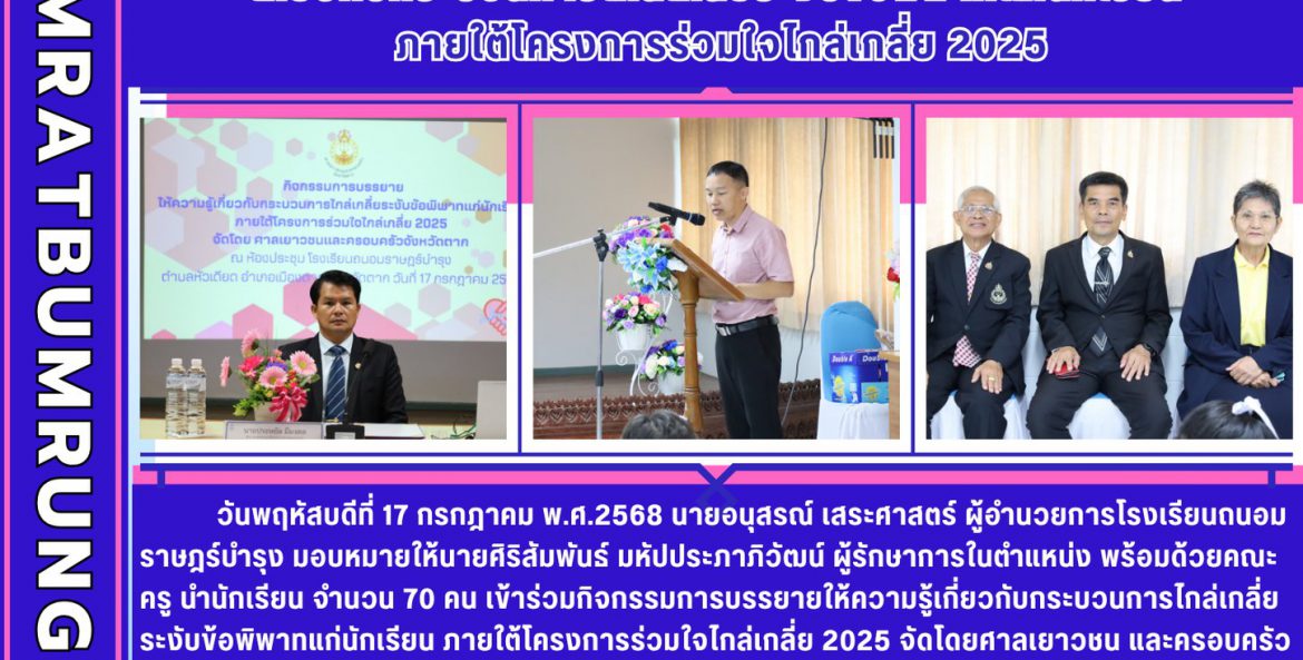 วันพฤหัสบดีที่ 17 กรกฎาคม พ.ศ.2568 นายอนุสรณ์ เสระศาสตร์ ผู้อำนวยการโรงเรียนถนอมราษฎร์บำรุง มอบหมายให้นายศิริสัมพันธ์ มหัปประภาภิวัฒน์ ผู้รักษาการในตำแหน่ง พร้อมด้วยคณะครู นำนักเรียน จำนวน 70 คน เข้าร่วมกิจกรรมการบรรยายให้ความรู้เกี่ยวกับกระบวนการไกล่เกลี่ยระงับข้อพิพาทแก่นักเรียน ภายใต้โครงการร่วมใจไกล่เกลี่ย 2025 จัดโดยศาลเยาวชน และครอบครัวจังหวัดตาก ณ ห้องประชุมโสตทัศนศึกษา “ธารน้ำใจ” โรงเรียนถนอมราษฎร์บำรุง