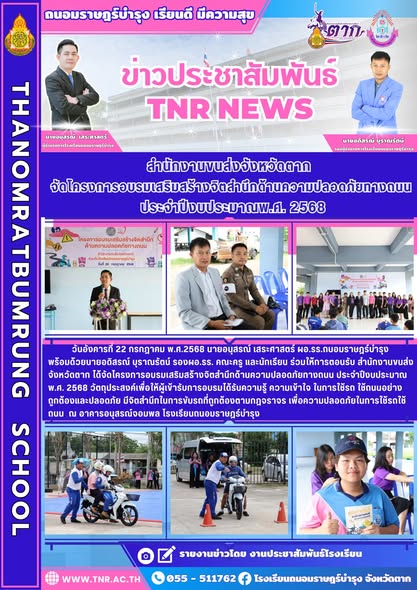 วันอังคารที่ 22 กรกฎาคม พ.ศ.2568 นายอนุสรณ์ เสระศาสตร์ ผอ.รร.ถนอมราษฎร์บำรุง พร้อมด้วยนายอดิสรณ์ บุราณรัตน์ รองผอ.รร. คณะครู และนักเรียน ร่วมให้การตอนรับ สำนักงานขนส่งจังหวัดตาก ได้จัดโครงการอบรมเสริมสร้างจิตสำนึกด้านความปลอดภัยทางถนน ประจำปีงบประมาณ พ.ศ. 2568 วัตถุประสงค์เพื่อให้ผู้เข้ารับการอบรมได้รับความรู้ ความเข้าใจ ในการใช้รถ ใช้ถนนอย่าง ถูกต้องและปลอดภัย มีจิตสำนึกในการขับรถที่ถูกต้องตามกฎจราจร เพื่อความปลอดภัยในการใช้รถใช้ถนน ณ อาคารอนุสรณ์จอมพล โรงเรียนถนอมราษฎร์บำรุง