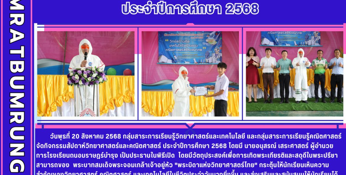 วันพุธที่ 20 สิงหาคม 2568 กลุ่มสาระการเรียนรู้วิทยาศาสตร์และเทคโนโลยี และกลุ่มสาระการเรียนรู้คณิตศาสตร์ จัดกิจกรรมสัปดาห์วิทยาศาสตร์และคณิตศาสตร์ ประจำปีการศึกษา 2568 โดยมี นายอนุสรณ์ เสระศาสตร์ ผู้อำนวยการโรงเรียนถนอมราษฎร์บำรุง เป็นประธานในพิธีเปิด นายศิริสัมพันธ์ มหัปประภาภิวัฒน์ หัวหน้ากลุ่มสาระการเรียนรู้วิทยาศาสตร์ และเทคโนโลยี เป็นผู้กล่าวรายงาน โดยมีวัตถุประสงค์เพื่อการเทิดพระเกียรติและสดุดีในพระปรีชาสามารถของพระบาทสมเด็จพระจอมเกล้าเจ้าอยู่หัว “พระบิดาแห่งวิทยาศาสตร์ไทย” กระตุ้นให้นักเรียนเห็นความสำคัญของวิทยาศาสตร์ คณิตศาสตร์ และเทคโนโลยีในชีวิตประจำวันมากยิ่งขึ้น ส่งเสริมและสนับสนุนให้นักเรียนได้มีส่วนร่วม แสดงออกซึ่งความรู้ ความสามารถตามความถนัดและสนใจ การมอบเกียรติบัตรให้แก่นักเรียนที่ได้รับรางวัลจากการแข่งขันกิจกรรมทักษะทางวิทยาศาสตร์และคณิตศาสตร์ในระดับโรงเรียน และประกวดชุดรีไซเคิล ณ หอประชุมโรงเรียนถนอมราษฎร์บำรุง