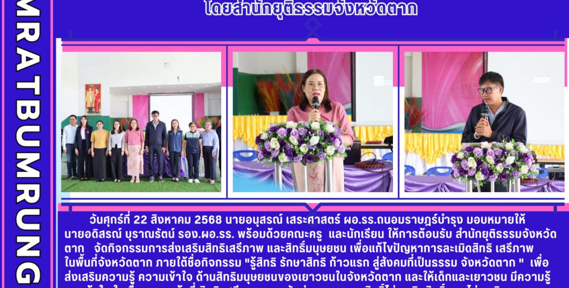 วันศุกร์ที่ 22 สิงหาคม 2568 นายอนุสรณ์ เสระศาสตร์ ผอ.รร.ถนอมราษฎร์บำรุง มอบหมายให้ นายอดิสรณ์ บุราณรัตน์ รอง.ผอ.รร. พร้อมด้วยคณะครู และนักเรียน ให้การต้อนรับ สำนักยุติธรรมจังหวัดตาก จัดกิจกรรมการส่งเสริมสิทธิเสรีภาพ และสิทธิ์มนุษยชน เพื่อแก้ไขปัญหาการละเมิดสิทธิ เสรีภาพ ในพื้นที่จังหวัดตาก ภายใต้ชื่อกิจกรรม “รู้สิทธิ รักษาสิทธิ ก้าวแรก สู่สังคมที่เป็นธรรม จังหวัดตาก ” เพื่อส่งเสริมความรู้ ความเข้าใจ ด้านสิทธิมนุษยชนของเยาวชนในจังหวัดตาก และให้เด็กและเยาวชน มีความรู้ และเข้าใจ ในเรื่องของหน้าที่ สิทธิ เสรีภาพตระหนักต่อการเคารพสิทธิ์ไม่ละเมิดสิทธิ์ และไม่ละเมิดกฎหมายซึ่งจะทำให้ปัญหาการละเมิดสิทธิน้อยลง ณ หอประชุมโรงเรียนถนอมราษฎร์บำรุง