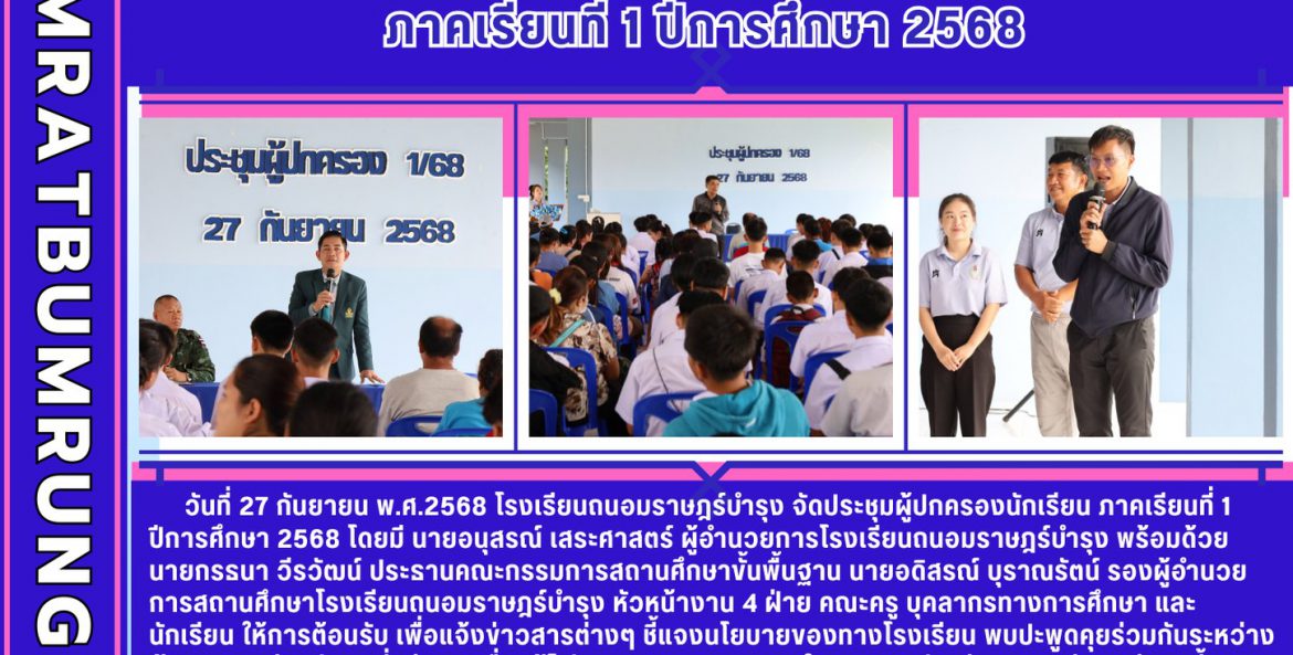 วันที่ 27 กันยายน พ.ศ.2568 โรงเรียนถนอมราษฎร์บำรุง จัดประชุมผู้ปกครองนักเรียน ภาคเรียนที่ 1 ปีการศึกษา 2568 โดยมี นายอนุสรณ์ เสระศาสตร์ ผู้อำนวยการโรงเรียนถนอมราษฎร์บำรุง พร้อมด้วย นายกรธนา วีรวัฒน์ ประธานคณะกรรมการสถานศึกษาขั้นพื้นฐาน นายอดิสรณ์ บุราณรัตน์ รองผู้อำนวยการสถานศึกษาโรงเรียนถนอมราษฎร์บำรุง หัวหน้างาน 4 ฝ่าย คณะครู บุคลากรทางการศึกษา และนักเรียน ให้การต้อนรับ เพื่อแจ้งข่าวสารต่างๆ ชี้แจงนโยบายของทางโรงเรียน พบปะพูดคุยร่วมกันระหว่างผู้ปกครอง ร่วมกันครูที่ปรึกษา เพื่อแก้ไขปัญหาและหาแนวทางในการดูแลนักเรียนตลอดปีการศึกษานี้ ณ อาคาร “อนุสรณ์จอมพล”โรงเรียนถนอมราษฎร์บำรุง