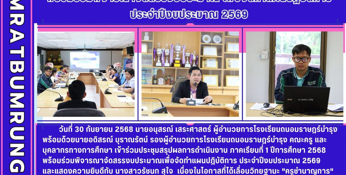 วันที่ 30 กันยายน 2568 นายอนุสรณ์ เสระศาสตร์ ผู้อำนวยการโรงเรียนถนอมราษฎร์บำรุง พร้อมด้วยนายอดิสรณ์ บุราณรัตน์ รองผู้อำนวยการโรงเรียนถนอมราษฎร์บำรุง คณะครู และบุคลากรทางการศึกษา เข้าร่วมประชุมสรุปผลการดำเนินงาน ภาคเรียนที่ 1 ปีการศึกษา 2568 พร้อมร่วมพิจารณาจัดสรรงบประมาณเพื่อจัดทำแผนปฎิบัติการ ประจำปีงบประมาณ 2569 และแสดงความยินดีกับ นางสาวรัชนก สุใจ เนื่องในโอกาสที่ได้เลื่อนวิทยฐานะ “ครูชำนาญการ” ณ ห้องประชุมโสตทัศนศึกษา “ธารน้ำใจ” โรงเรียนถนอมราษฎร์บำรุง