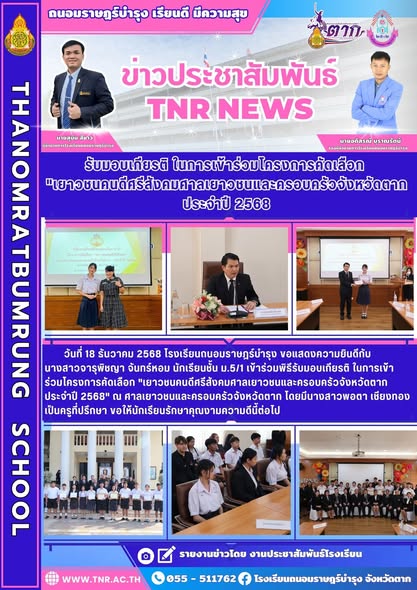 วันที่ 18 ธันวาคม 2568 โรงเรียนถนอมราษฎร์บำรุง ขอแสดงความยินดีกับ นางสาวจารุพิชญา จันทร์หอม นักเรียนชั้น ม.5/1 เข้าร่วมพิธีรับมอบเกียรติ ในการเข้าร่วมโครงการคัดเลือก “เยาวชนคนดีศรีสังคมศาลเยาวชนและครอบครัวจังหวัดตาก ประจำปี 2568” ณ ศาลเยาวชนและครอบครัวจังหวัดตาก โดยมีนางสาวพอตา เชียงทอง เป็นครูที่ปรึกษา ขอให้นักเรียนรักษาคุณงามความดีนี้ต่อไป