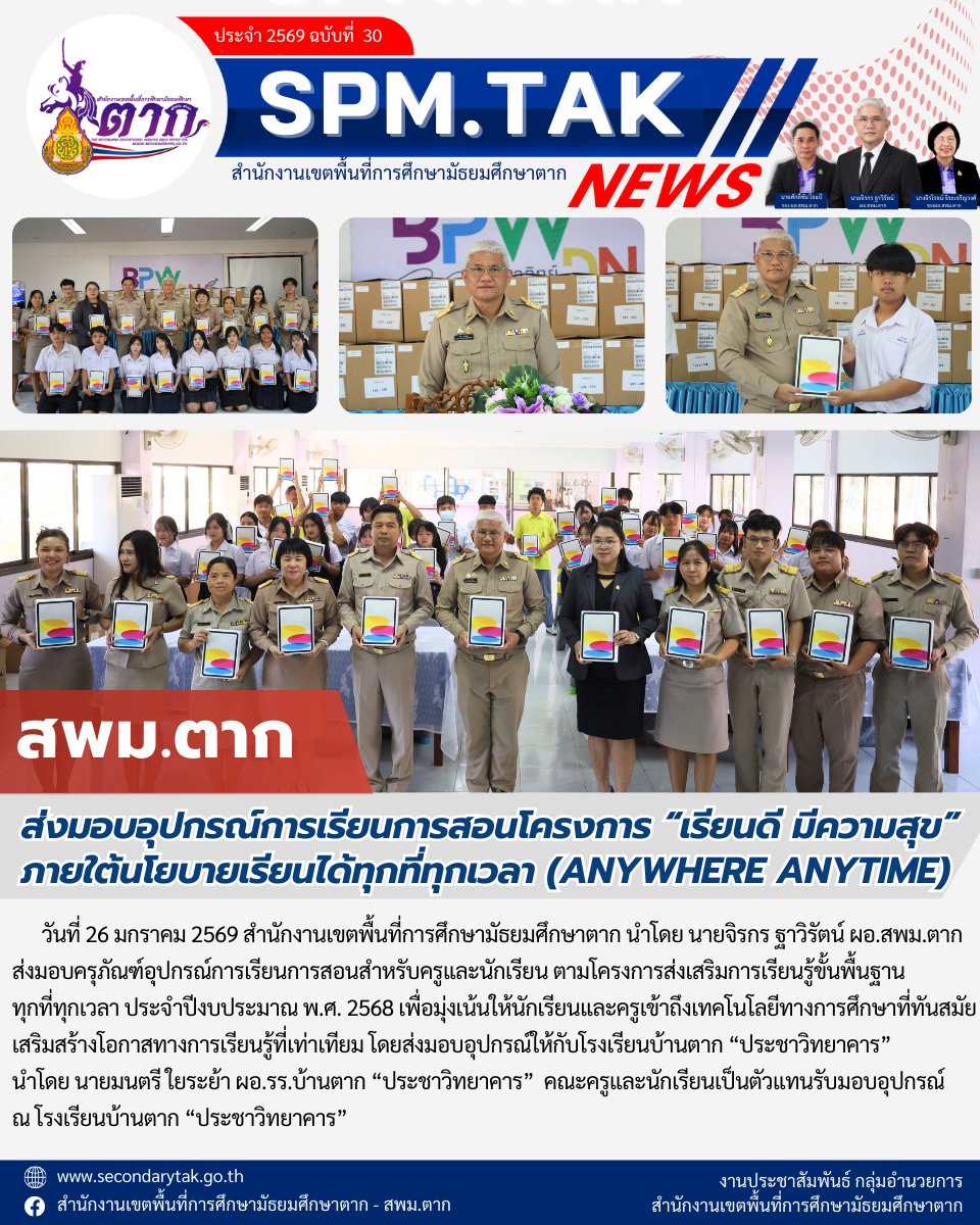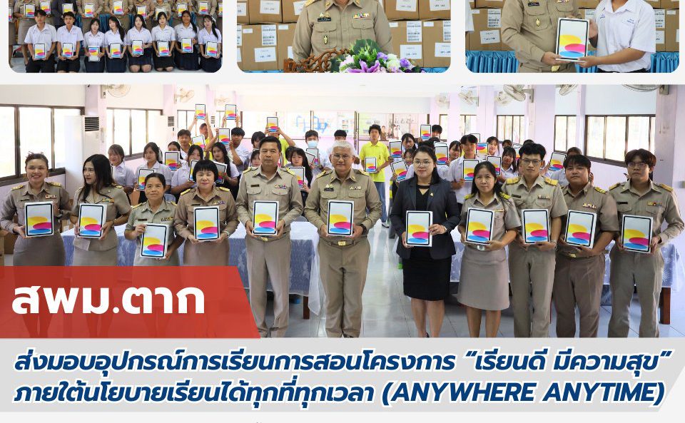 ส่งมอบอุปกรณ์การเรียนการสอนโครงการ “เรียนดี มีความสุข” ภายใต้นโยบายเรียนได้ทุกที่ทุกเวลา (ANYWHERE ANYTIME) ร.ร.บ้านตาก ประชาวิทยาคาร วรวุฒิ เนื้อนิ่ม 27 มกราคม 2569 จำนวนคนดู 2