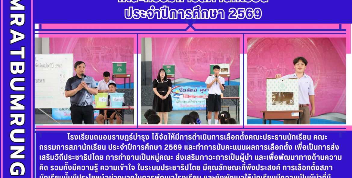โรงเรียนถนอมราษฎร์บำรุง ได้จัดให้มีการดำเนินการเลือกตั้งคณะประธานนักเรียน คณะกรรมการสภานักเรียน ประจำปีการศึกษา 2569 และทำการนับคะแนนผลการเลือกตั้ง เพื่อเป็นการส่งเสริมวิถีประชาธิปไตย การทำงานเป็นหมู่คณะ ส่งเสริมภาวะการเป็นผู้นำ และเพื่อพัฒนาทางด้านความคิด รวมทั้งมีความรู้ ความเข้าใจ ในระบบประชาธิปไตย มีคุณลักษณะที่พึงประสงค์ การเลือกตั้งสภานักเรียนนั้นมีประโยชน์อย่างมากในการพัฒนาโรงเรียน และยังพัฒนาให้นักเรียนมีความเป็นผู้นำที่มีคุณภาพ มีความรับผิดชอบในสังคม พร้อมทั้งยังส่งเสริมประชาธิปไตยในโรงเรียนให้ดียิ่งขึ้นไปอีกด้วย