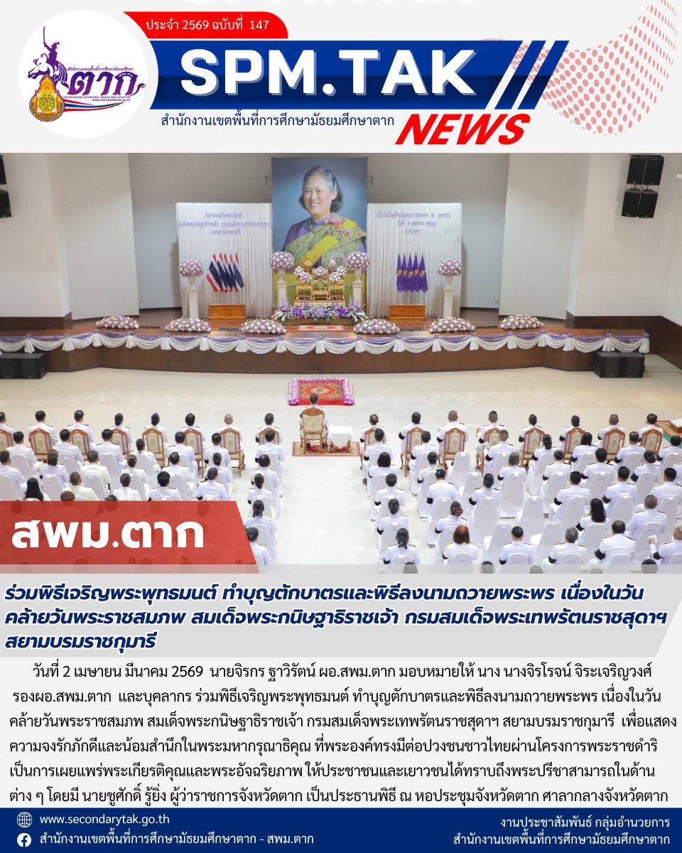 ร่วมพิธีเจริญพระพุทรมนต์ ทำบุญตักบาตรและพิธีลงนามถวายพระพร เนื่องในวัน คล้ายวันพระราชสมภพ สมเด็จพระกนิษฐาธิราชเจ้า กรมสมเด็จพระเทพร้ตนราชสุดาฯ สยามบรมราชกุมารี วรวุฒิ เนื้อนิ่ม 2 เมษายน 2569 จำนวนคนดู 0