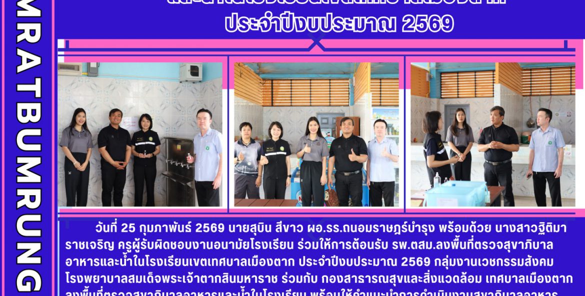 วันที่ 25 กุมภาพันธ์ 2569 นายสุบิน สีขาว ผอ.รร.ถนอมราษฎร์บำรุง พร้อมด้วย นางสาวฐิติมา ราชเจริญ ครูผู้รับผิดชอบงานอนามัยโรงเรียน ร่วมให้การต้อนรับ รพ.ตสม.ลงพื้นที่ตรวจสุขาภิบาลอาหารและน้ำในโรงเรียนเขตเทศบาลเมืองตาก ประจำปีงบประมาณ 2569 กลุ่มงานเวชกรรมสังคม โรงพยาบาลสมเด็จพระเจ้าตากสินมหาราช ร่วมกับ กองสาธารณสุขและสิ่งแวดล้อม เทศบาลเมืองตาก ลงพื้นที่ตรวจสุขาภิบาลอาหารและน้ำในโรงเรียน พร้อมให้คำแนะนำการดำเนินงานสุขาภิบาลอาหาร การดูแลสิ่งแวดล้อม การกำจัดขยะให้ถูกสุขลักษณะ และได้ใช้ชุดตรวจโคลิฟอร์มแบคที่เรีย อ11,อ13 ตรวจตัวอย่างน้ำ,ภาชนะอุปกรณ์ที่ใช้ใส่อาหาร,ผู้สัมผัสอาหาร และสุ่มตรวจคลอรีนอิสระคงเหลือในน้ำ (อ31) ณ โรงอาหารโรงเรียนถนอมราษฎร์บำรุง