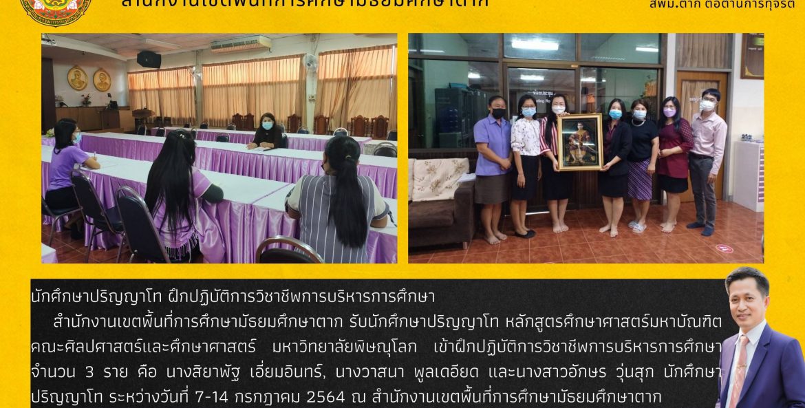 สำนักงานเขตพื้นที่การศึกษามัธยมศึกษาตาก รับนักศึกษาปริญญาโท หลักสูตรศึกษาศาสตร์มหาบัณฑิต คณะศิลปศาสตร์และศึกษาศาสตร์ มหาวิทยาลัยพิษณุโลก เข้าฝึกปฏิบัติการวิชาชีพการบริหารการศึกษา จำนวน 3 ราย คือ นางสิยาพัฐ เอี่ยมอินทร์, นางวาสนา พูลเดอียด และนางสาวอักษร วุ่นสุก นักศึกษาปริญญาโท ระหว่างวันที่ 7-14 กรกฎาคม 2564 ณ สำนักงานเขตพื้นที่การศึกษามัธยมศึกษาตาก