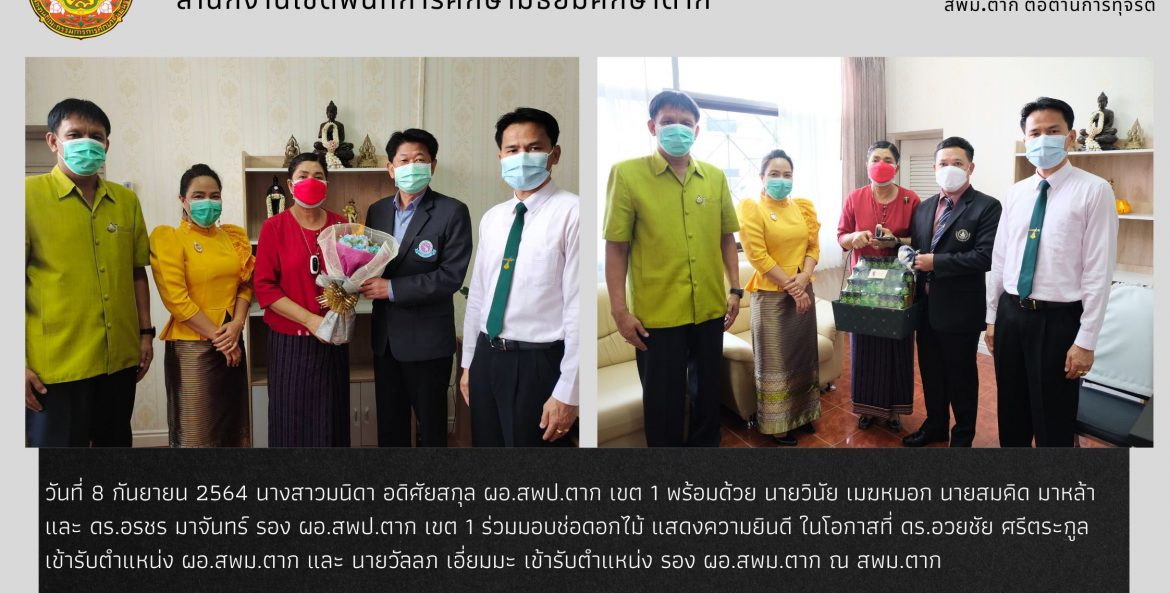 วันที่ 8 กันยายน 2564 นางสาวมนิดา อดิศัยสกุล ผอ.สพป.ตาก เขต 1 พร้อมด้วย นายวินัย เมฆหมอก นายสมคิด มาหล้า และ ดร.อรชร มาจันทร์ รอง ผอ.สพป.ตาก เขต 1 ร่วมมอบช่อดอกไม้ แสดงความยินดี ในโอกาสที่ ดร.อวยชัย ศรีตระกูล เข้ารับตำแหน่ง ผอ.สพม.ตาก และ นายวัลลภ เอี่ยมมะ เข้ารับตำแหน่ง รอง ผอ.สพม.ตาก ณ สพม.ตาก