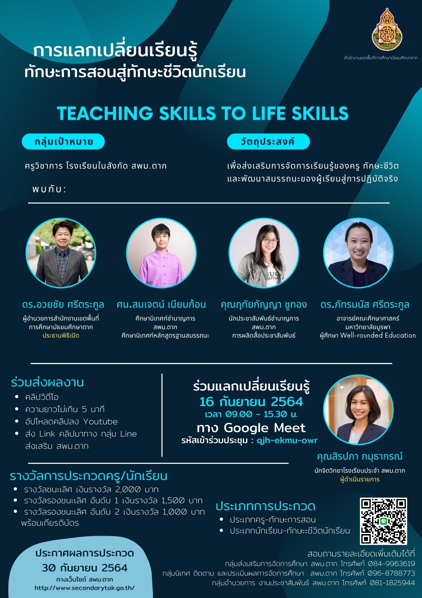 วันที่ 16 กันยายน 2564 สำนักงานเขตพื้นที่การศึกษามัธยมศึกษาตาก จัดการประชุมเสวนาทักษะการสอนสู่ทักษะชีวิตนักเรียน (teaching skills to life skills) เพื่อส่งเสริมการจัดการเรียนรู้ของครู ทักษะชีวิต และพัฒนาสมรรถนะของผู้เรียนสู่การปฏิบัติจริงให้กับครูวิชาการ ของโรงเรียนในสังกัด จำนวน 21 โรงเรียน ผ่านระบบออนไลน์ ด้วยโปรแกรม Google meet
