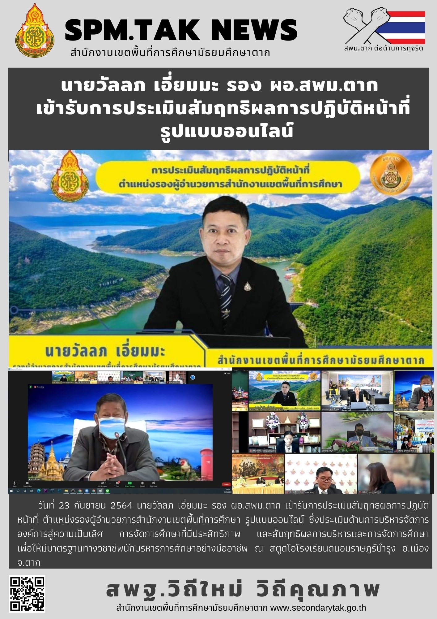 วันที่ 23 กันยายน 2564 นายวัลลภ เอี่ยมมะ รอง ผอ.สพม.ตาก เข้ารับการประเมินสัมฤทธิผลการปฏิบัติหน้าที่ ตำแหน่งรองผู้อำนวยการสำนักงานเขตพื้นที่การศึกษา รูปแบบออนไลน์ ซึ่งประเมินด้านการบริหารจัดการองค์การสู่ความเป็นเลิศ การจัดการศึกษาที่มีประสิทธิภาพ และสัมฤทธิผลการบริหารและการจัดการศึกษา เพื่อให้มีมาตรฐานทางวิชาชีพนักบริหารการศึกษาอย่างมืออาชีพ ณ สตูดิ