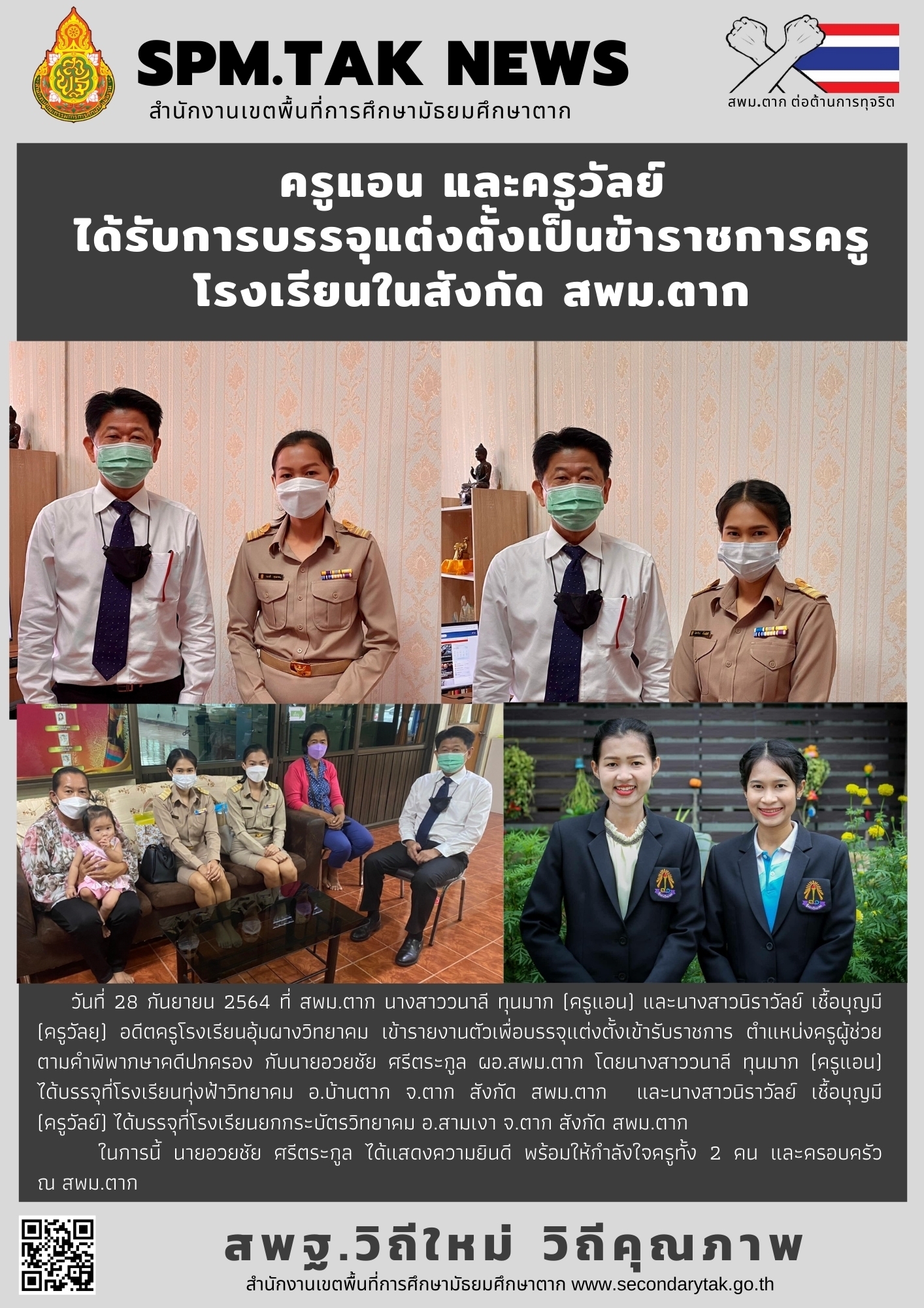 ในการนี้ นายอวยชัย ศรีตระกูล ได้แสดงความยินดี พร้อมให้กำลังใจครูทั้ง 2 คน และครอบครัว ณ สพม.ตาก