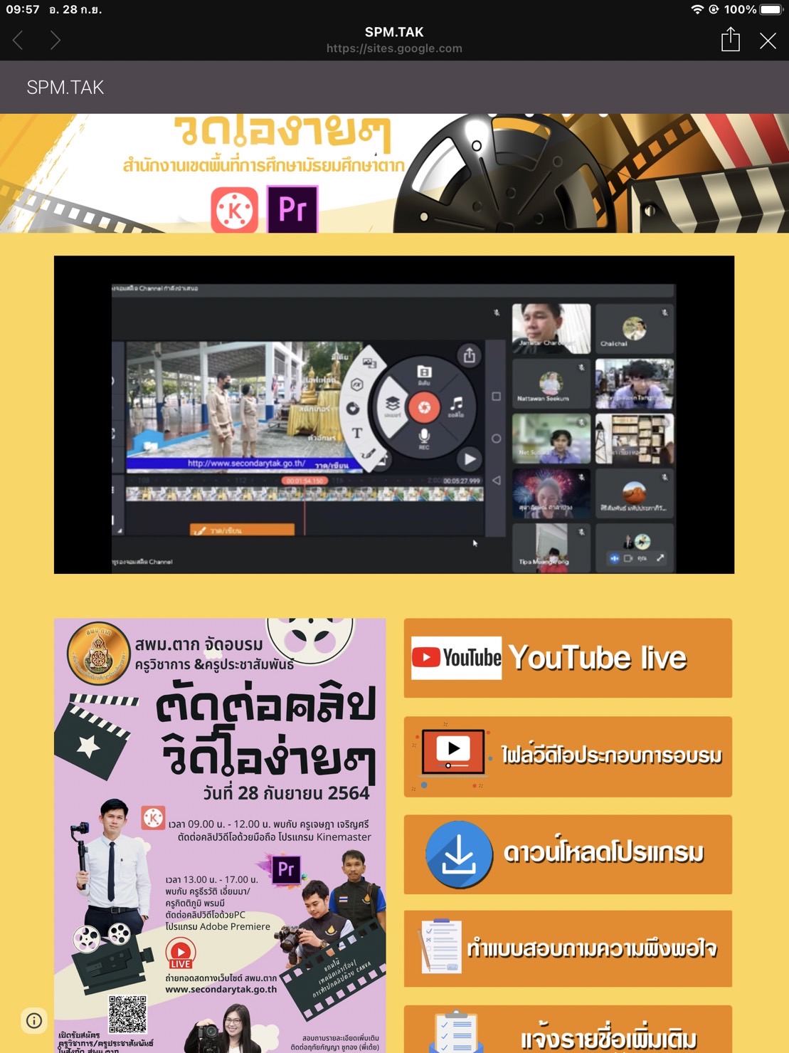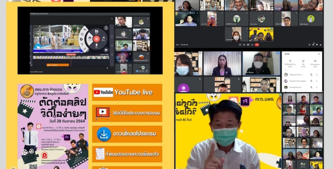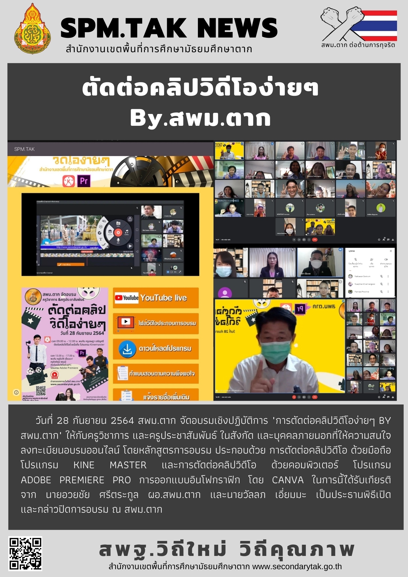 วันที่ 28 กันยายน 2564 สพม.ตาก จัดอบรมเชิงปฏิบัติการ “การตัดต่อคลิปวิดีโอง่ายๆ By สพม.ตาก” ให้กับครูวิชาการ และครูประชาสัมพันธ์ ในสังกัด และบุคคลภายนอกที่ให้ความสนใจ ลงทะเบียนอบรมออนไลน์ โดยหลักสูตรการอบรม ประกอบด้วย การตัดต่อคลิปวิดีโอ ด้วยมือถือ โปรแกรม Kine Master และการตัดต่อคลิปวิดีโอ ด้วยคอมพิวเตอร์ โปรแกรม Adobe Premiere Pro การออกแบบอินโฟกราฟิก โดย CanVa ในการนี้ได้รับเกียรติ จาก นายอวยชัย ศรีตระกูล ผอ.สพม.ตาก และนายวัลลภ เอี่ยมมะ เป็นประธานพิธีเปิด และกล่าวปิดการอบรม ณ สพม.ตาก