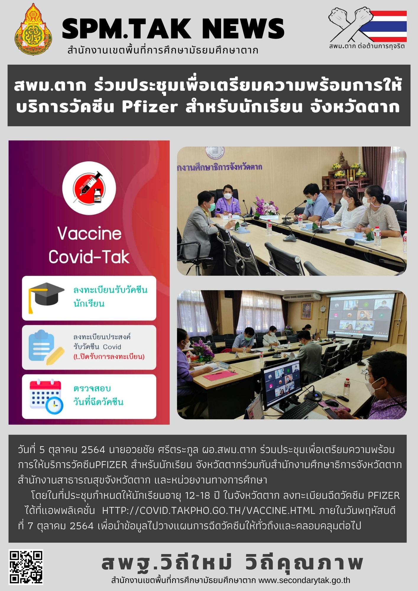 โดยในที่ประชุมกำหนดให้นักเรียนอายุ 12-18 ปี ในจังหวัดตาก ลงทะเบียนฉีดวัคซีน Pfizer ได้ที่แอพพลิเคชั่น http://covid.takpho.go.th/vaccine.html ภายในวันพฤหัสบดี ที่ 7 ตุลาคม 2564 เพื่อนำข้อมูลไปวางแผนการฉีดวัคซีนให้ทั่วถึงและคลอบคลุมต่อไป