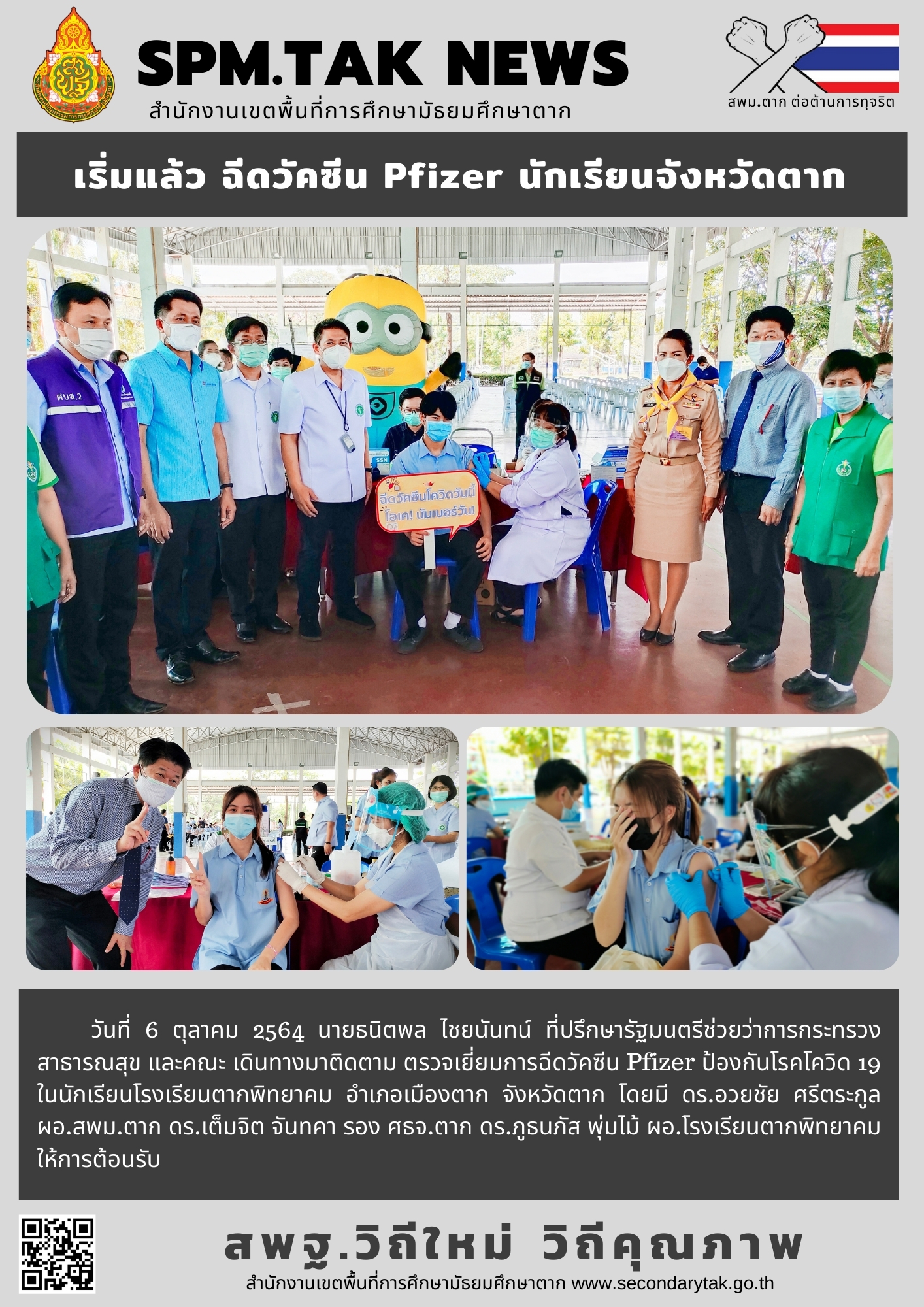 วันที่ 6 ตุลาคม 2564 นายธนิตพล ไชยนันทน์ ที่ปรึกษารัฐมนตรีช่วยว่าการกระทรวงสาธารณสุข และคณะ เดินทางมาติดตาม ตรวจเยี่ยมการฉีดวัคซีน Pfizer ป้องกันโรคโควิด 19 ในนักเรียนโรงเรียนตากพิทยาคม อำเภอเมืองตาก จังหวัดตาก โดยมี ดร.อวยชัย ศรีตระกูล ผอ.สพม.ตาก ดร.เต็มจิต จันทคา รอง ศธจ.ตาก ดร.ภูธนภัส พุ่มไม้ ผอ.โรงเรียนตากพิทยาคม ให้การต้อนรับ