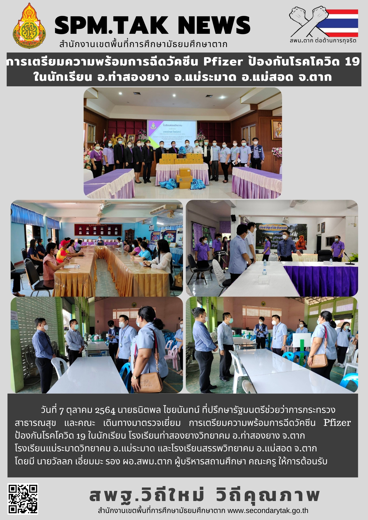 สาธารณสุข และคณะ เดินทางมาตรวจเยี่ยม การเตรียมความพร้อมการฉีดวัคซีน Pfizer ป้องกันโรคโควิด 19 ในนักเรียน โรงเรียนท่าสองยางวิทยาคม อ.ท่าสองยาง จ.ตาก โรงเรียนแม่ระมาดวิทยาคม อ.แม่ระมาด และโรงเรียนสรรพวิทยาคม อ.แม่สอด จ.ตาก โดยมี นายวัลลภ เอี่ยมมะ รอง ผอ.สพม.ตาก ผู้บริหารสถานศึกษา คณะครู ให้การต้อนรับ