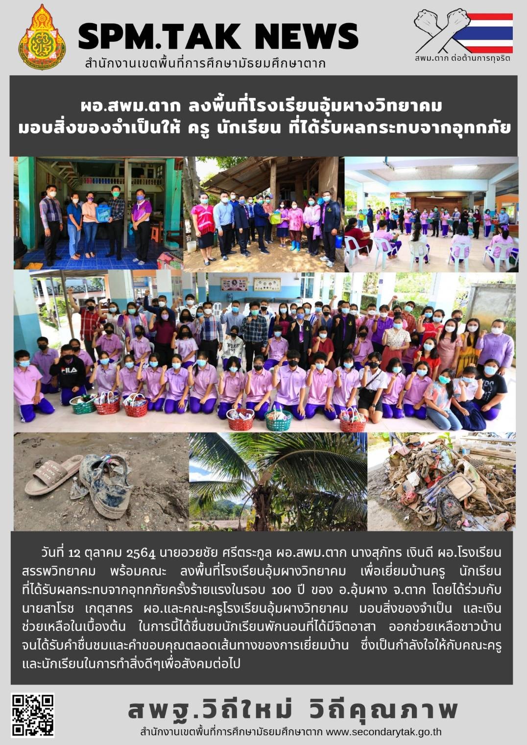 12 ตุลาคม 2564 นายอวยชัย ศรีตระกูล ผอ.สพม.ตาก นางสุภัทร เงินดี ผอ.โรงเรียนสรรพวิทยาคม พร้อมคณะ ลงพื้นที่โรงเรียนอุ้มผางวิทยาคม เพื่อเยี่ยมบ้านครู นักเรียน ที่ได้รับผลกระทบจากอุทกภัยครั้งร้ายแรงในรอบ 100 ปี ของ อ.อุ้มผาง จ.ตาก โดยได้ร่วมกับ นายสาโรช เกตุสาคร ผอ.และคณะครูโรงเรียนอุ้มผางวิทยาคม มอบสิ่งของจำเป็น และเงินช่วยเหลือในเบื้องต้น ในการนี้ได้ชื่นชมนักเรียนพักนอนที่ได้มีจิตอาสา ออกช่วยเหลือชาวบ้าน จนได้รับคำชื่นชมและคำขอบคุณตลอดเส้นทางของการเยี่ยมบ้าน ซึ่งเป็นกำลังใจให้กับคณะครูและนักเรียนในการทำสิ่งดีๆเพื่อสังคมต่อไป