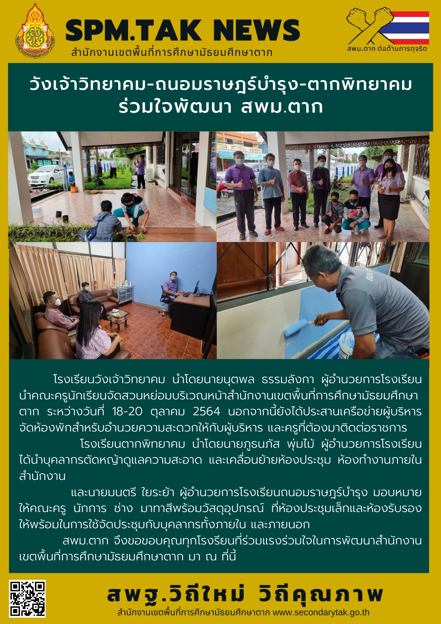 โรงเรียนวังเจ้าวิทยาคม นำโดยนายนุตพล ธรรมลังกา ผู้อำนวยการโรงเรียน นำคณะครูนักเรียนจัดสวนหย่อมบริเวณหน้าสำนักงานเขตพื้นที่การศึกษามัธยมศึกษาตาก ระหว่างวันที่ 18-20 ตุลาคม 2564 นอกจากนี้ยังได้ประสานเครือข่ายผู้บริหาร จัดห้องพักสำหรับอำนวยความสะดวกให้กับผู้บริหาร และครูที่ต้องมาติดต่อราชการ