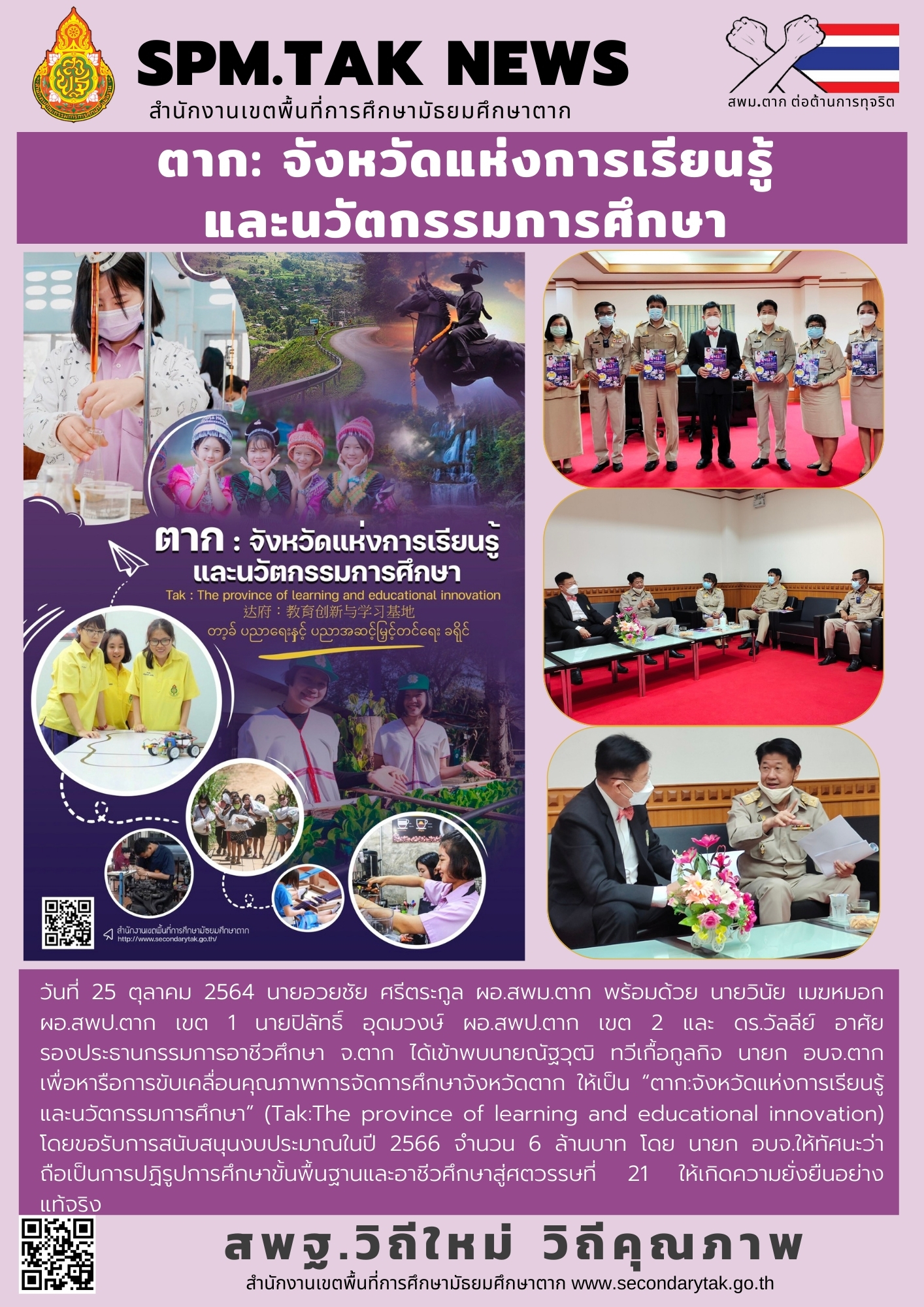 วันที่ 25 ตุลาคม 2564 นายอวยชัย ศรีตระกูล ผอ.สพม.ตาก พร้อมด้วย นายวินัย เมฆหมอก ผอ.สพป.ตาก เขต 1 นายปิลัทธิ์ อุดมวงษ์ ผอ.สพป.ตาก เขต 2 และ ดร.วัลลีย์ อาศัย รองประธานกรรมการอาชีวศึกษา จ.ตาก ได้เข้าพบนายณัฐวุฒิ ทวีเกื้อกูลกิจ นายก อบจ.ตาก เพื่อหารือการขับเคลื่อนคุณภาพการจัดการศึกษาจังหวัดตาก ให้เป็น“ตาก : จังหวัดแห่งการเรียนรู้และนวัตกรรมการศึกษา” (Tak:The province of learning and educational innovation) ณ อบจ.ตาก