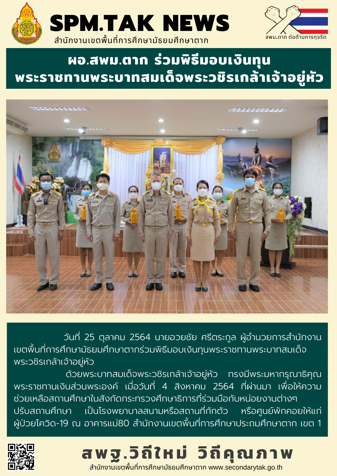 วันที่ 25 ตุลาคม 2564 นายอวยชัย ศรีตระกูล ผู้อำนวยการสำนักงานเขตพื้นที่การศึกษามัธยมศึกษาตากร่วมพิธีมอบเงินทุนพระราชทานพระบาทสมเด็จ พระวชิรเกล้าเจ้าอยู่หัว