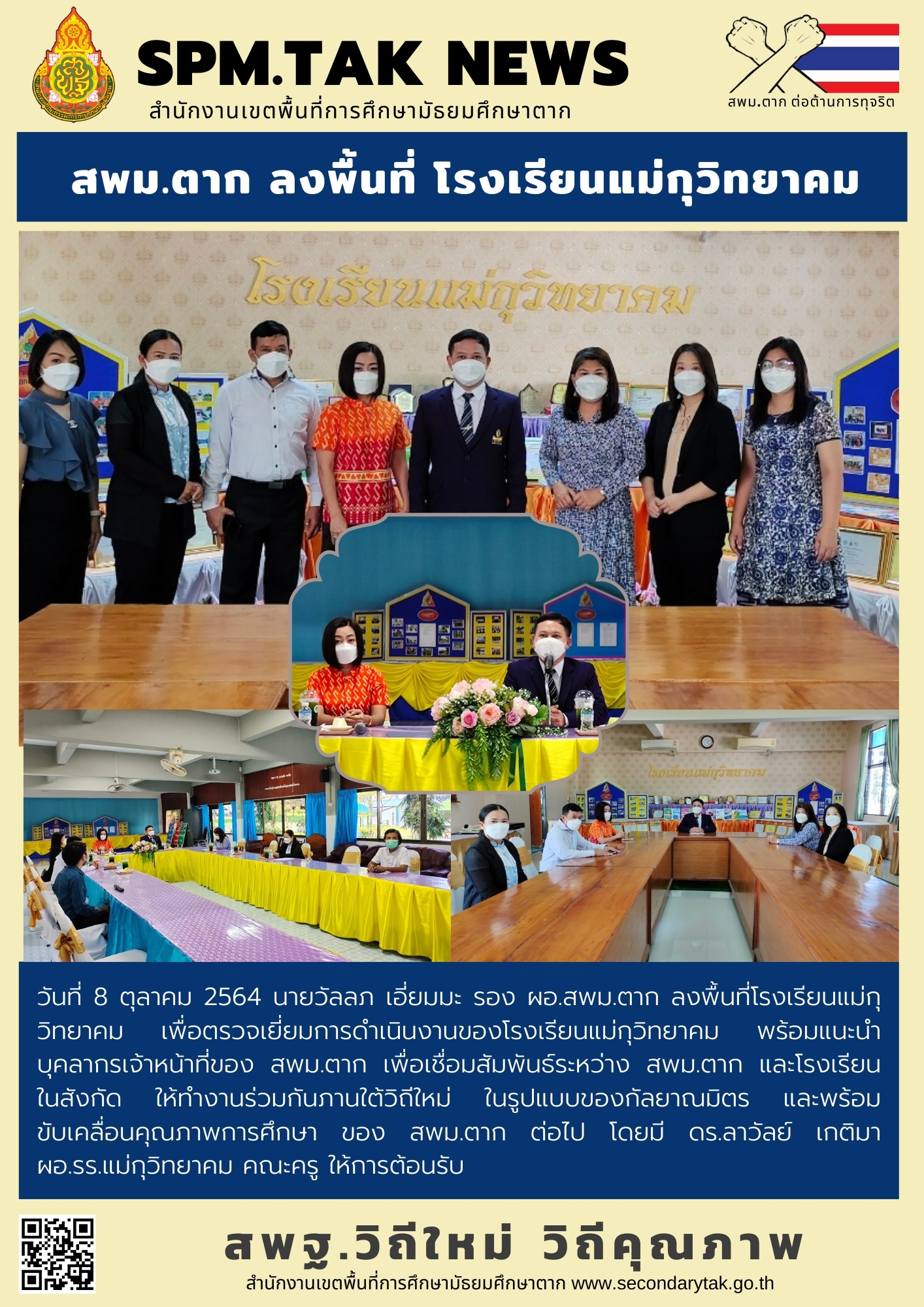 วันที่ 8 ตุลาคม 2564 นายวัลลภ เอี่ยมมะ รอง ผอ.สพม.ตาก ลงพื้นที่โรงเรียนแม่กุวิทยาคม เพื่อตรวจเยี่ยมการดำเนินงานของโรงเรียนแม่กุวิทยาคม พร้อมแนะนำบุคลากรเจ้าหน้าที่ของ สพม.ตาก เพื่อเชื่อมสัมพันธ์ระหว่าง สพม.ตาก และโรงเรียนในสังกัด ให้ทำงานร่วมกันภายใต้วิถีใหม่ ในรูปแบบของกัลยาณมิตร และพร้อมขับเคลื่อนคุณภาพการศึกษา ของ สพม.ตาก ต่อไป โดยมี ดร.ลาวัลย์ เกติมา ผอ.รร.แม่กุวิทยาคม คณะครู ให้การต้อนรับ
