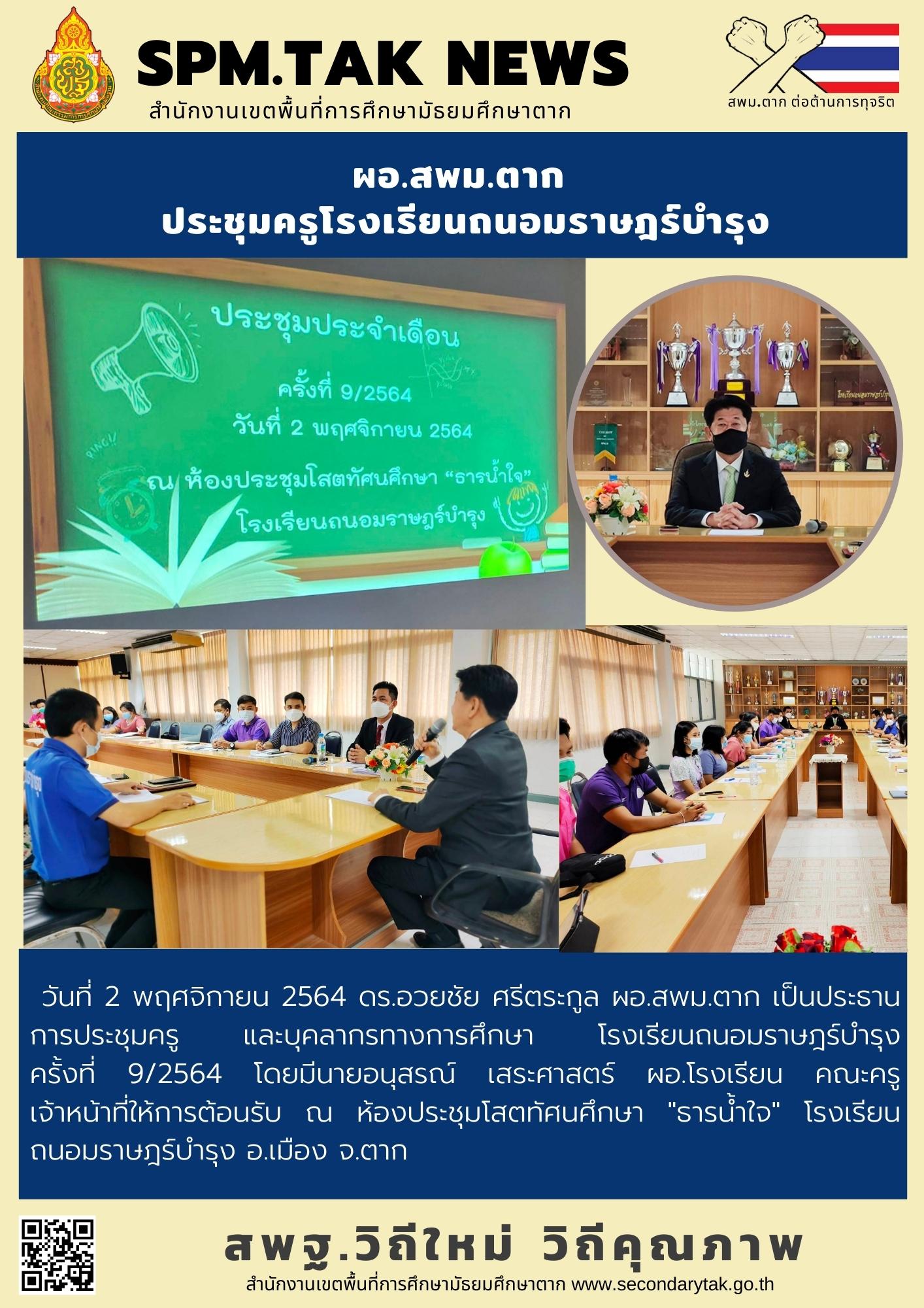 วันที่ 2 พฤศจิกายน 2564 ดร.อวยชัย ศรีตระกูล ผอ.สพม.ตาก เป็นประธานการประชุมครู และบุคลากรทางการศึกษา โรงเรียนถนอมราษฎร์บำรุง ครั้งที่ 9/2564 โดยมีนายอนุสรณ์ เสระศาสตร์ ผอ.โรงเรียน คณะครู เจ้าหน้าที่ให้การต้อนรับ ณ ห้องประชุมโสตทัศนศึกษา “ธารน้ำใจ” โรงเรียนถนอมราษฎร์บำรุง อ.เมือง จ.ตาก