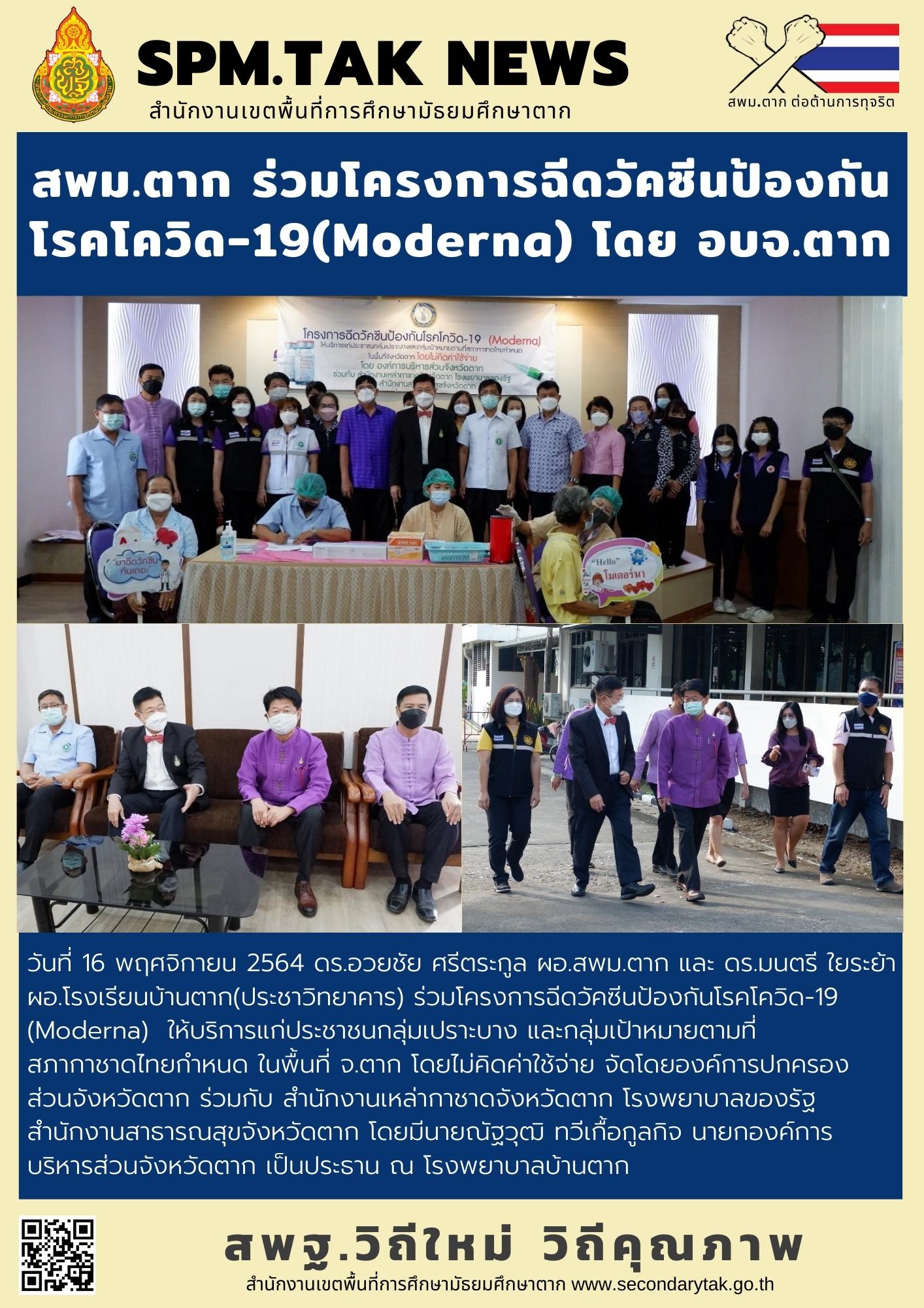 วันที่ 16 พฤศจิกายน 2564 ดร.อวยชัย ศรีตระกูล ผอ.สพม.ตาก และ ดร.มนตรี ใยระย้าผอ.โรงเรียนบ้านตาก(ประชาวิทยาคาร) ร่วมโครงการฉีดวัคซีนป้องกันโรคโควิด-19 (Moderna) ให้บริการแก่ประชาชนกลุ่มเปราะบาง และกลุ่มเป้าหมายตามที่สภากาชาดไทยกำหนด ในพื้นที่ จ.ตาก โดยไม่คิดค่าใช้จ่าย จัดโดยองค์การปกครอง ส่วนจังหวัดตาก ร่วมกับ สำนักงานเหล่ากาชาดจังหวัดตาก โรงพยาบาลของรัฐ สำนักงานสาธารณสุขจังหวัดตาก โดยมีนายณัฐวุฒิ ทวีเกื้อกูลกิจ นายกองค์การบริหารส่วนจังหวัดตาก เป็นประธาน ณ โรงพยาบาลบ้านตาก