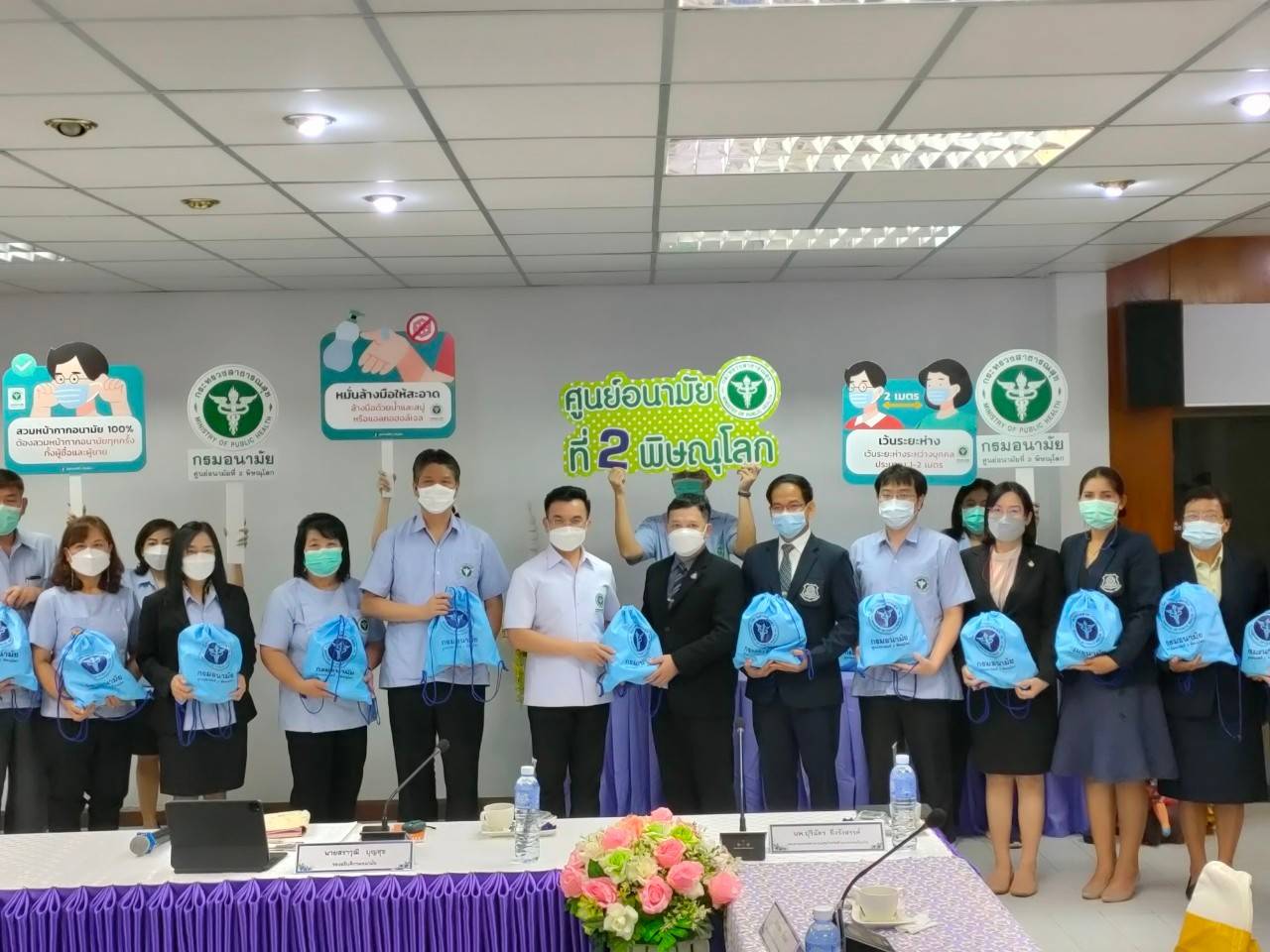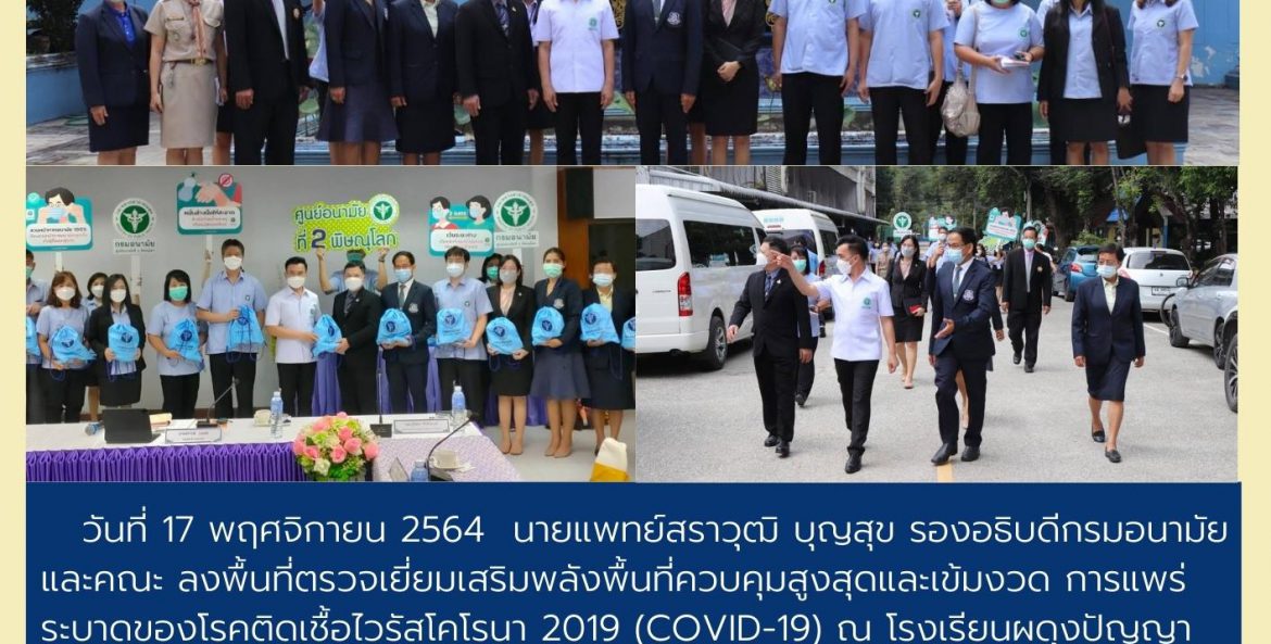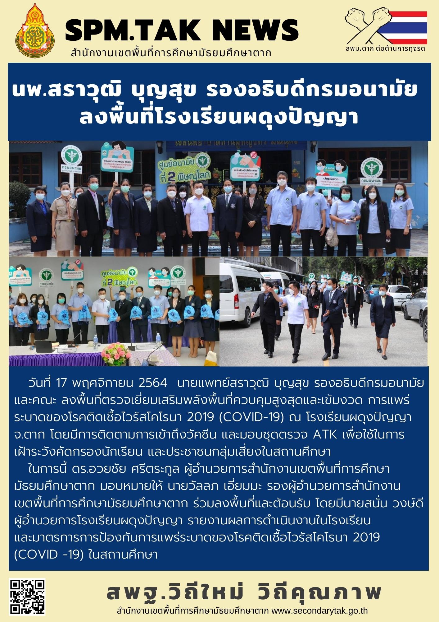 วันที่ 17 พฤศจิกายน 2564 นายแพทย์สราวุฒิ บุญสุข รองอธิบดีกรมอนามัย และคณะ ลงพื้นที่ตรวจเยี่ยมเสริมพลังพื้นที่ควบคุมสูงสุดและเข้มงวด การแพร่ระบาดของโรคติดเชื้อไวรัสโคโรนา 2019 (COVID-19) ณ โรงเรียนผดุงปัญญา จ.ตาก โดยมีการติดตามการเข้าถึงวัคซีน และมอบชุดตรวจ ATK เพื่อใช้ในการ เฝ้าระวังคัดกรองนักเรียน และประชาชนกลุ่มเสี่ยงในสถานศึกษา