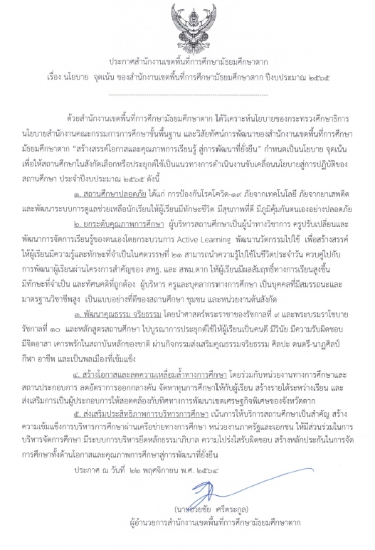 นโยบาย จุดเน้น ของสำนักงานเขตพื้นที่การศึกษามัธยมศึกษาตาก ปีงบประมาณ 2565 วรวุฒิ เนื้อนิ่ม 22 พฤศจิกายน 2564 จำนวนคนดู 33