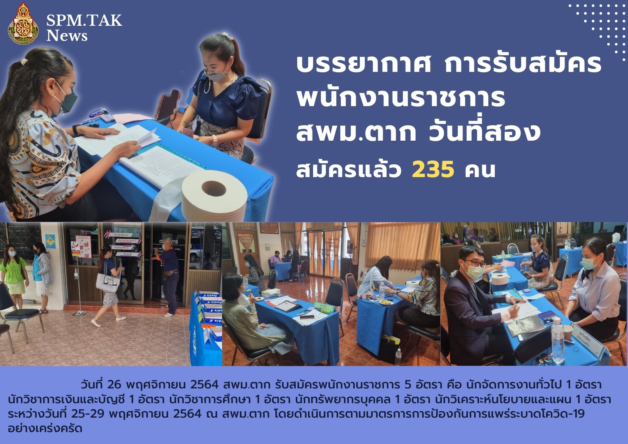 วันที่ 26 พฤศจิกายน 2564 สพม.ตาก รับสมัครพนักงานราชการ 5 อัตรา คือ นักจัดการงานทั่วไป 1 อัตรา นักวิชาการเงินและบัญชี 1 อัตรา นักวิชาการศึกษา 1 อัตรา นักทรัพยากรบุคคล 1 อัตรา นักวิเคราะห์นโยบายและแผน 1 อัตรา ระหว่างวันที่ 25-29 พฤศจิกายน 2564 ณ สพม.ตาก โดยดำเนินการตามมาตรการการป้องกันการแพร่ระบาดโควิด-19 อย่างเคร่งครัด