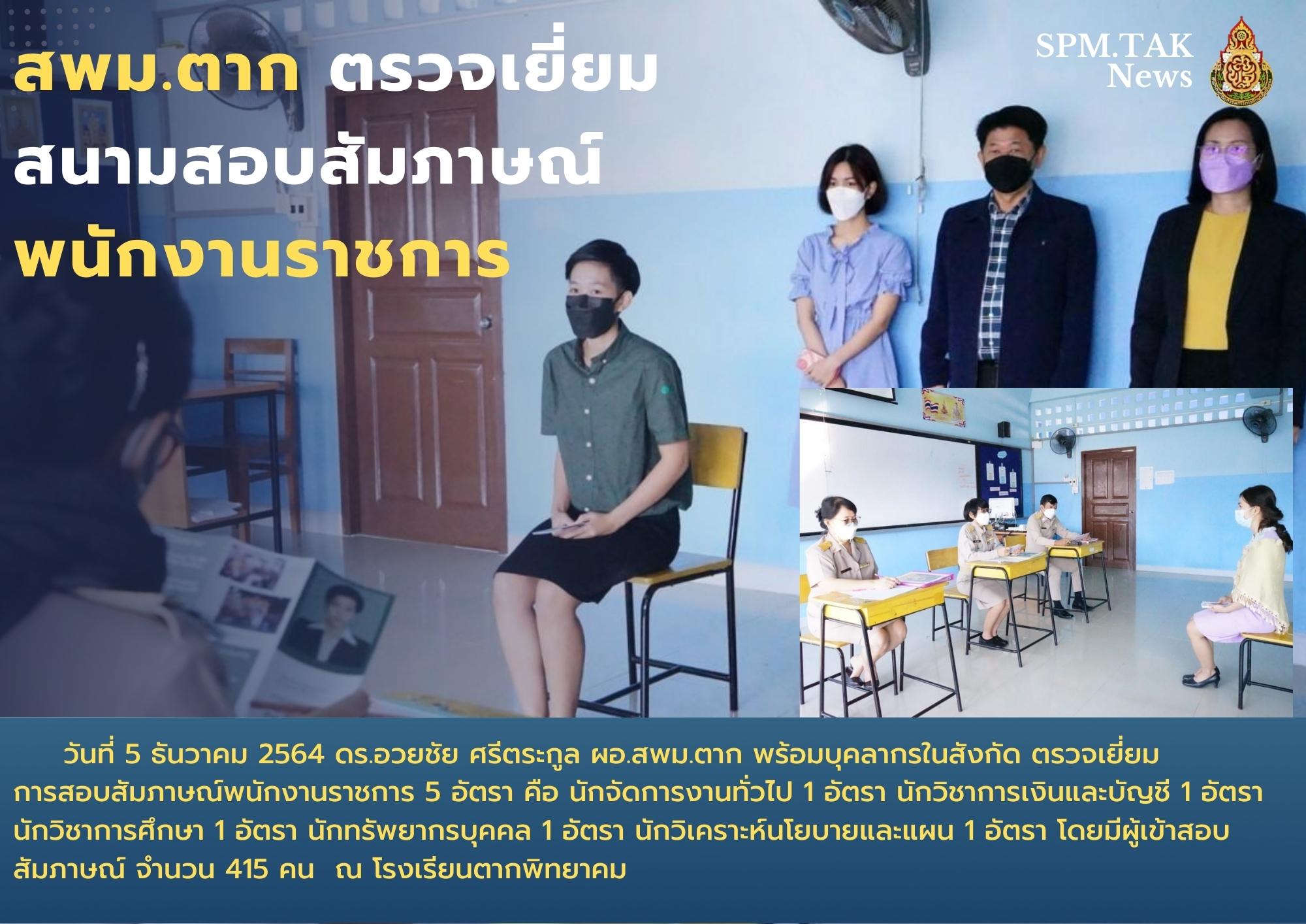 วันที่ 5 ธันวาคม 2564 ดร.อวยชัย ศรีตระกูล ผอ.สพม.ตาก พร้อมบุคลากรในสังกัด ตรวจเยี่ยมการสอบสัมภาษณ์พนักงานราชการ 5 อัตรา คือ นักจัดการงานทั่วไป 1 อัตรา นักวิชาการเงินและบัญชี 1 อัตรา นักวิชาการศึกษา 1 อัตรา นักทรัพยากรบุคคล 1 อัตรา นักวิเคราะห์นโยบายและแผน 1 อัตรา โดยมีผู้เข้าสอบสัมภาษณ์ จำนวน 415 คน ณ โรงเรียนตากพิทยาคม