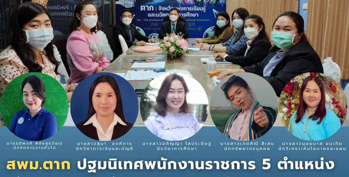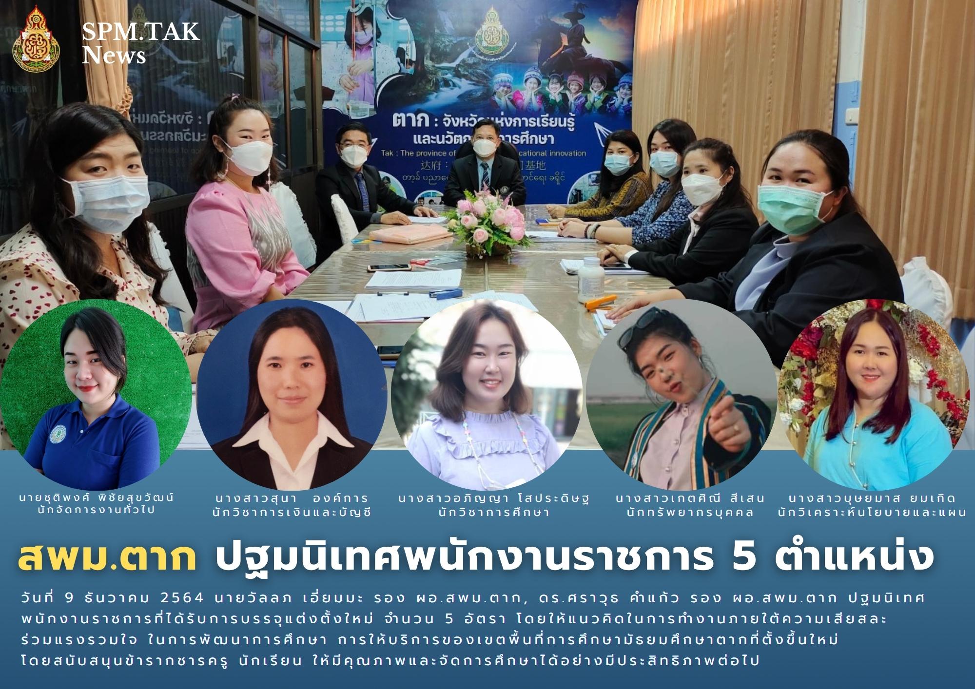 วันที่ 9 ธันวาคม 2564 นายวัลลภ เอี่ยมมะ รอง ผอ.สพม.ตาก, ดร.ศราวุธ คำแก้ว รอง ผอ.สพม.ตาก ปฐมนิเทศพนักงานราชการที่ได้รับการบรรจุแต่งตั้งใหม่ จำนวน 5 อัตรา โดยให้แนวคิดในการทำงานภายใต้ความเสียสละ ร่วมแรงรวมใจ ในการพัฒนาการศึกษา การให้บริการของเขตพื้นที่การศึกษามัธยมศึกษาตากที่ตั้งขึ้นใหม่ โดยสนับสนุนข้ารากชารครู นักเรียน ให้มีคุณภาพและจัดการศึกษาได้อย่างมีประสิทธิภาพต่อไป