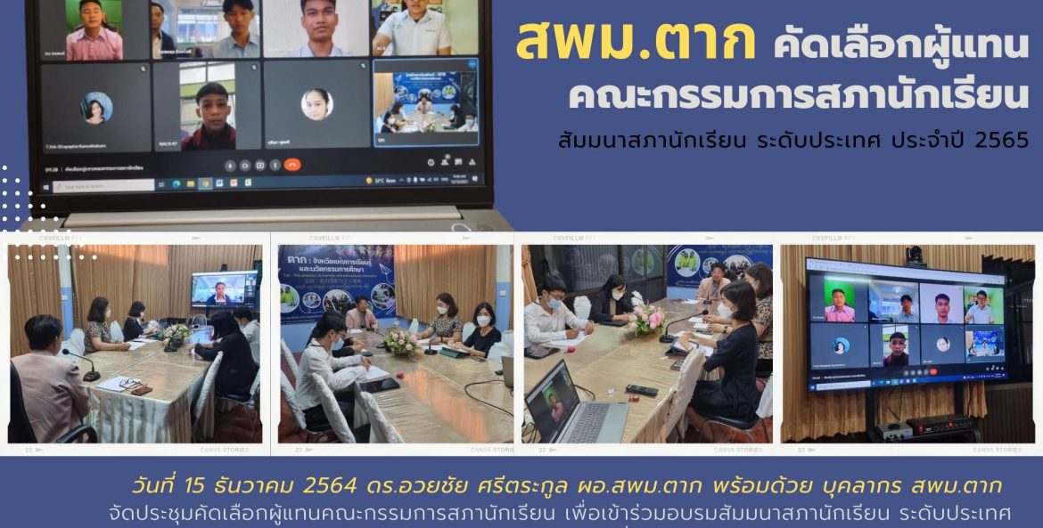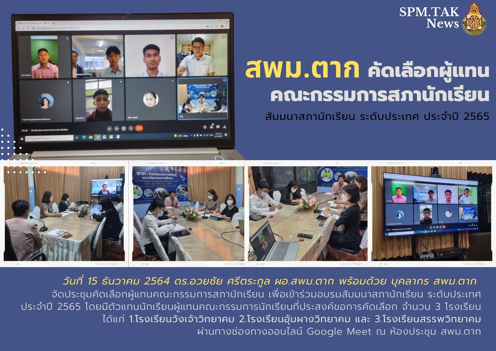 วันที่ 15 ธันวาคม 2564 ดร.อวยชัย ศรีตระกูล ผอ.สพม.ตาก พร้อมด้วย บุคลากร สพม.ตาก จัดประชุมคัดเลือกผู้แทนคณะกรรมการสภานักเรียน เพื่อเข้าร่วมอบรมสัมมนาสภานักเรียน ระดับประเทศ ประจำปี 2565 โดยมีตัวแทนนักเรียนผู้แทนคณะกรรมการนักเรียนที่ประสงค์ขอการคัดเลือก จำนวน 3 โรงเรียน ได้แก่ 1.โรงเรียนวังเจ้าวิทยาคม 2.โรงเรียนอุ้มผางวิทยาคม และ 3.โรงเรียนสรรพวิทยาคม ผ่านทางช่องทางออนไลน์ Google Meet ณ ห้องประชุม สพม.ตาก